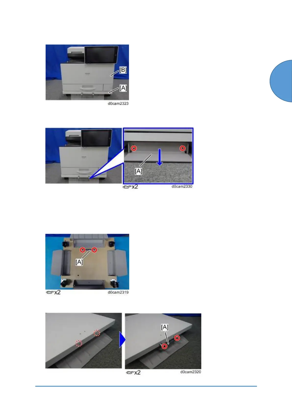 1. Attach the handle [A] removed in step 1 to the screw holes on the front of the caster table.
