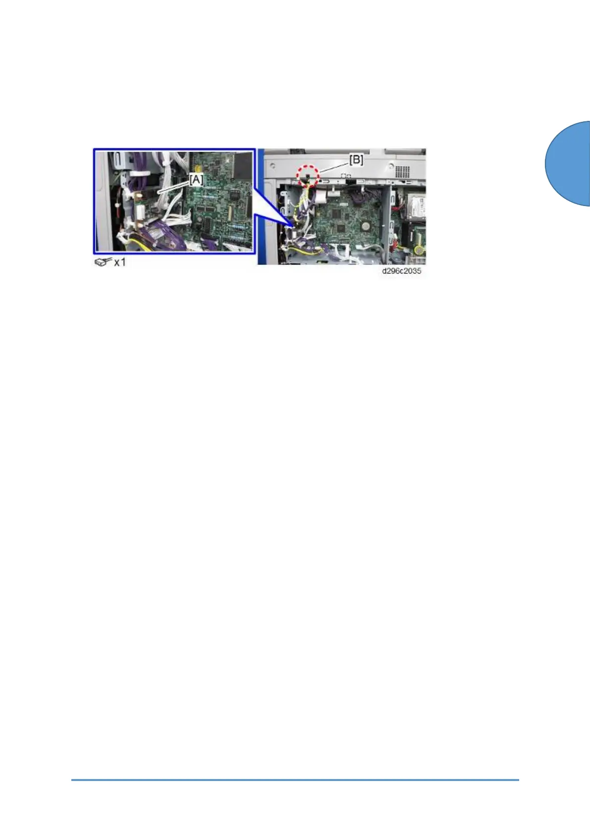 10. Route the harness through the scanner rear cover [B] as shown below.
