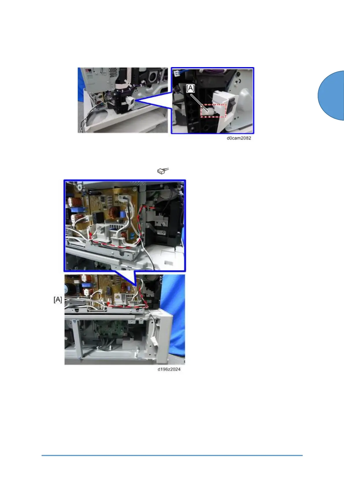 13. Connect the connector [A] to CN600 on the PSU (PCB17) and route the junction harness