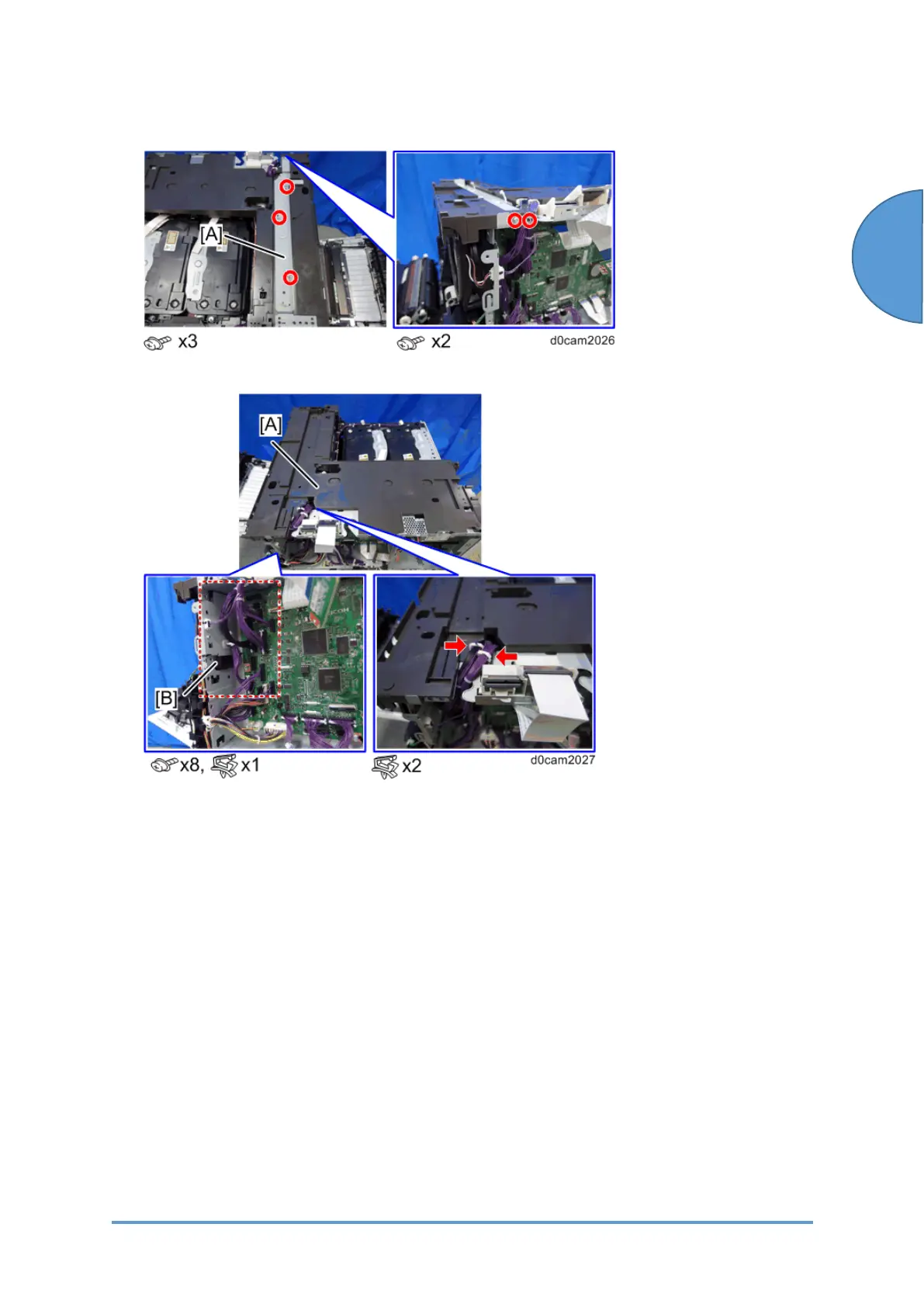 6. Disconnect the harnesses [B] to remove the inner cover [A].