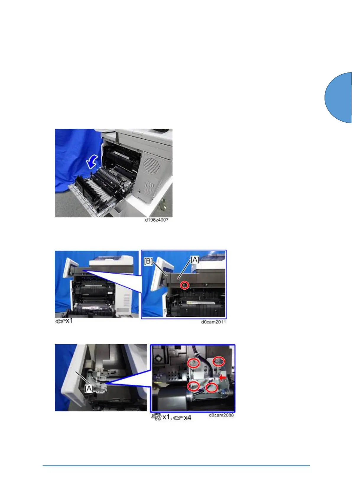 2. Remove the front right cover [A] and hinge cover [B].