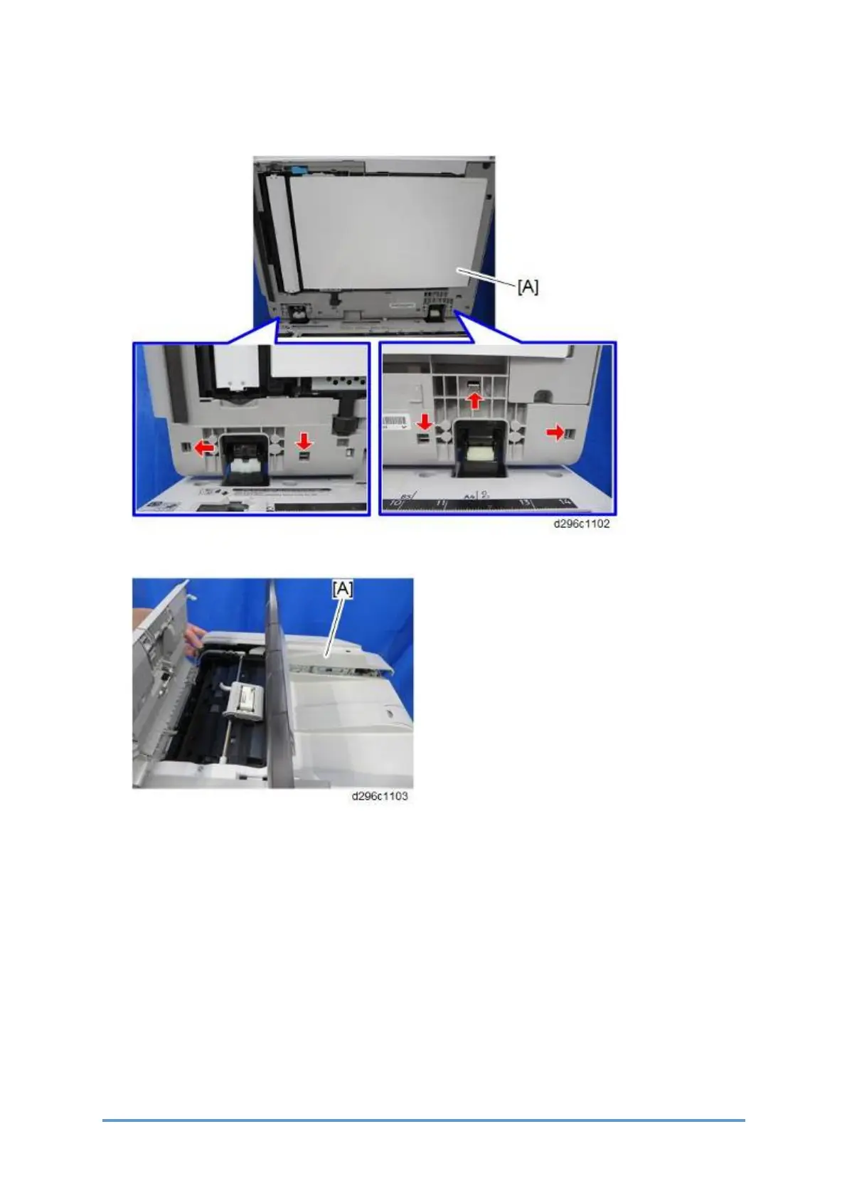 3. Open the ADF [A], and release the five tabs of the ADF rear cover by using a thin