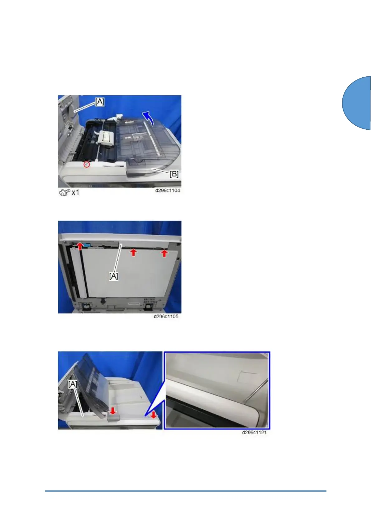 3. Open the ADF, then release the three tabs of the ADF front cover [A].