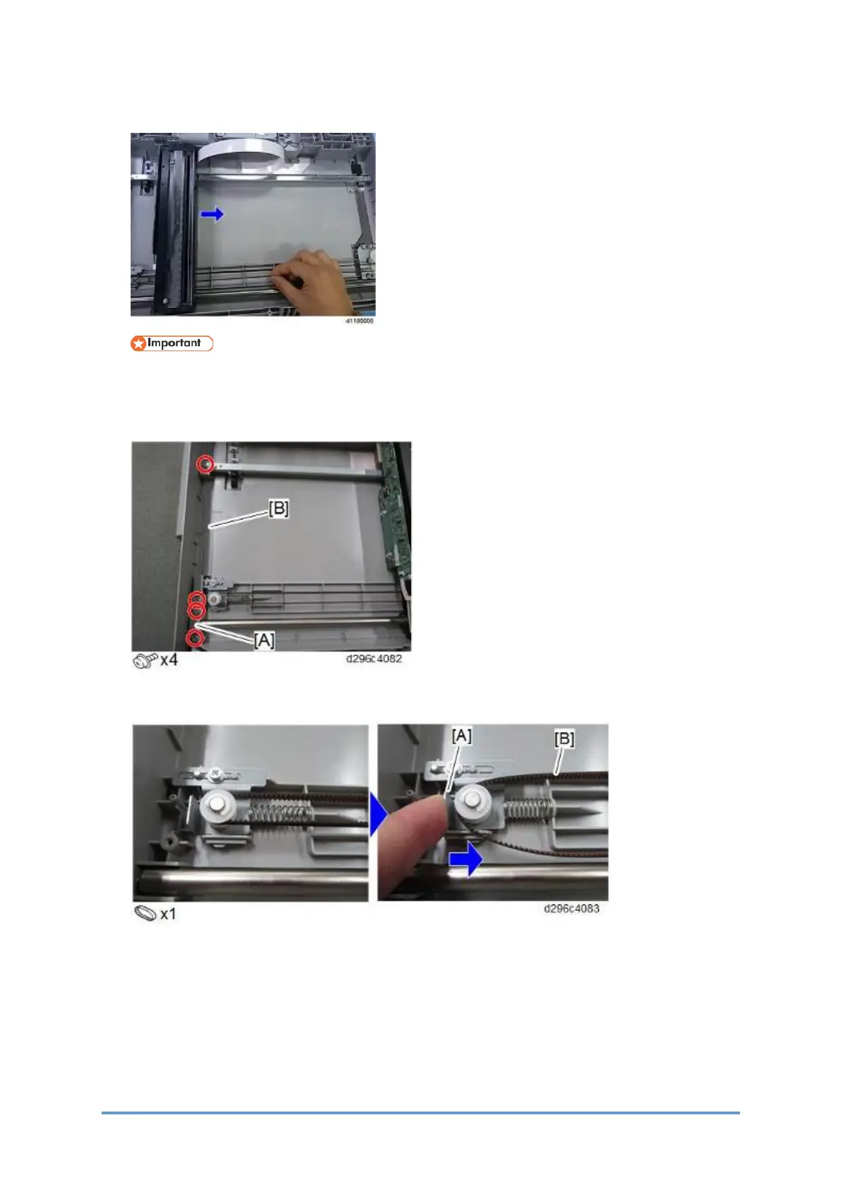 6. Slide the bracket [A] and then detach the carriage belt [B] from the pulley.