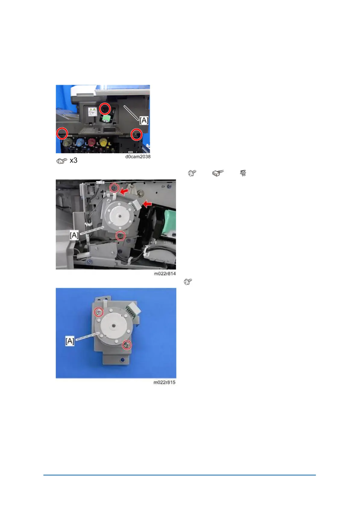 3. Remove the exit guide plate motor bracket [A] ( x 2, x 1, x 1).