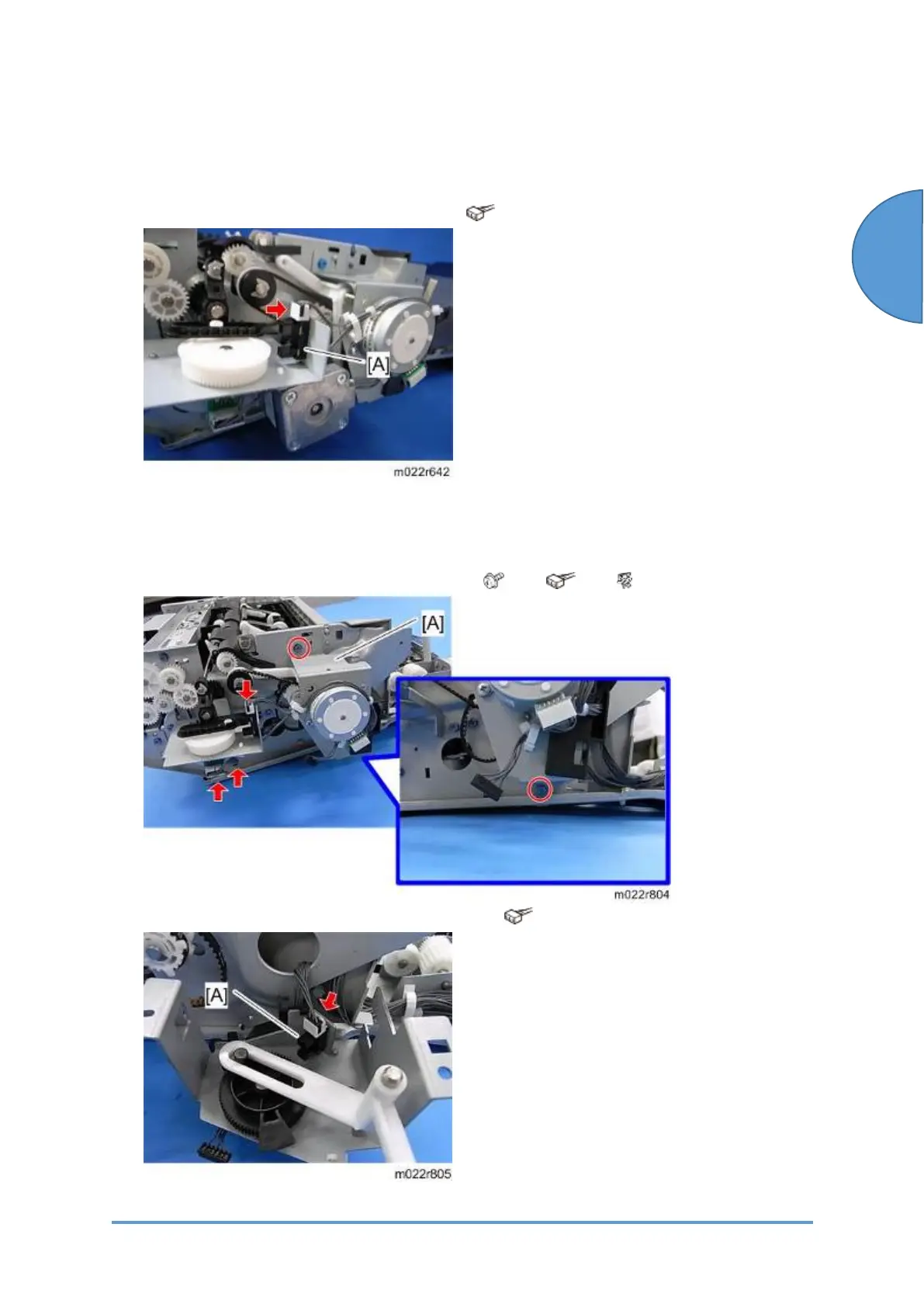 2. Remove the gathering roller motor bracket [A] ( x 2, x 2, x 1).