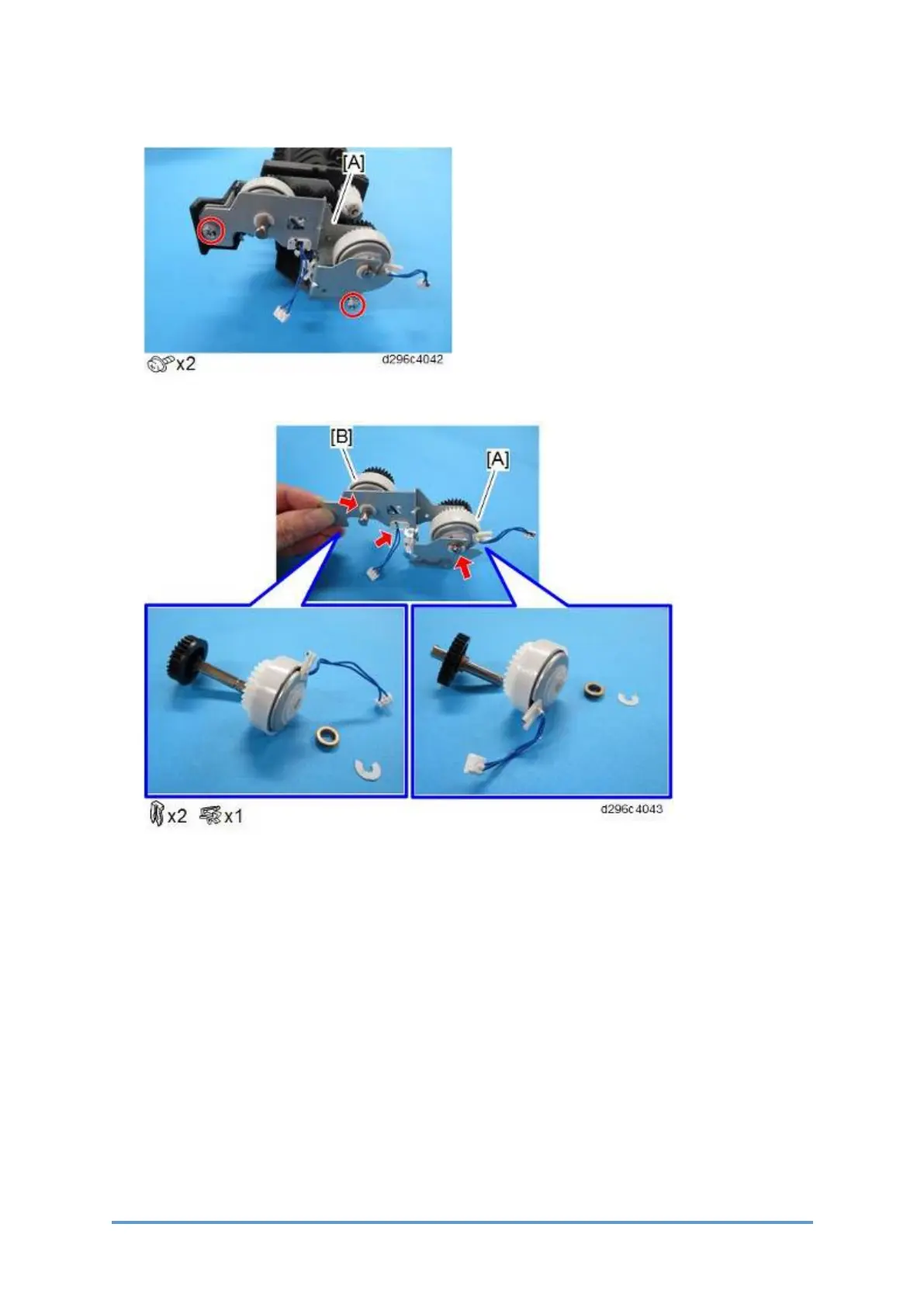 5. Remove the paper exit clutch (CL3) [A] and reverse clutch (CL2) [B].