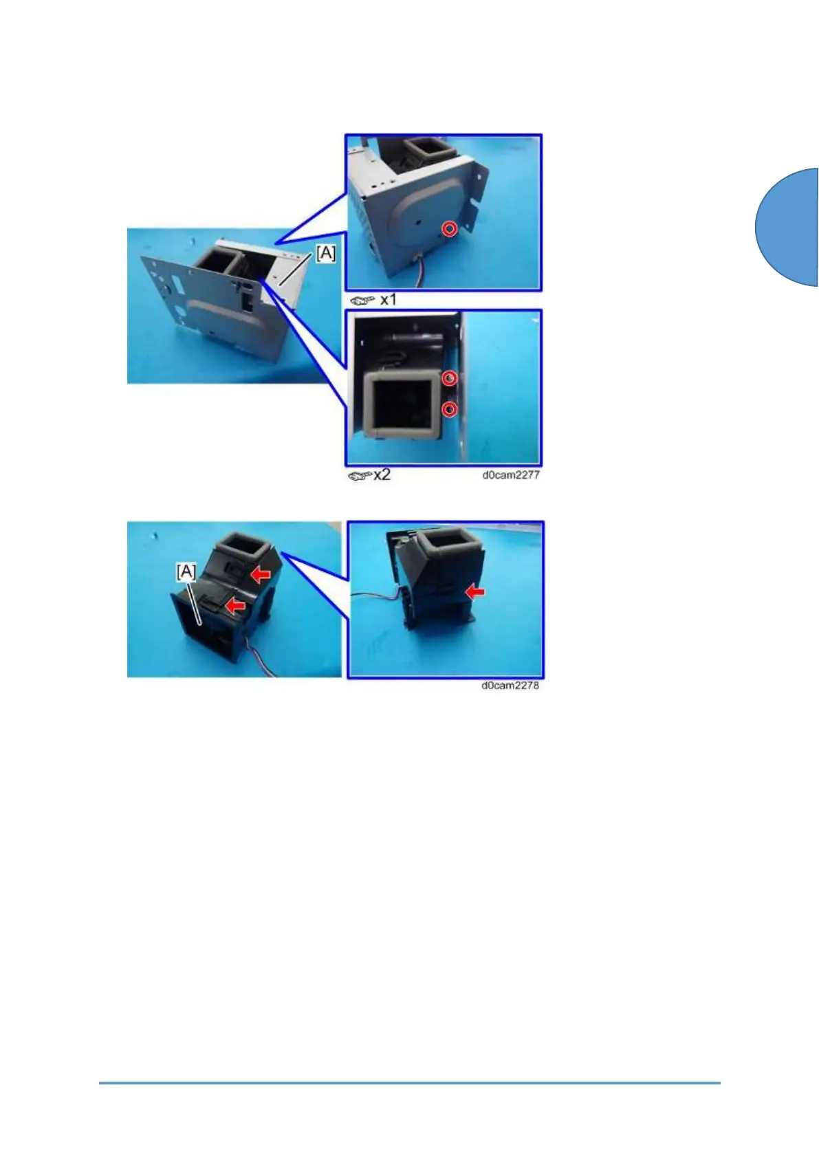 11. Remove the paper exit exhaust fan (FAN5) [A] (Hook×3).