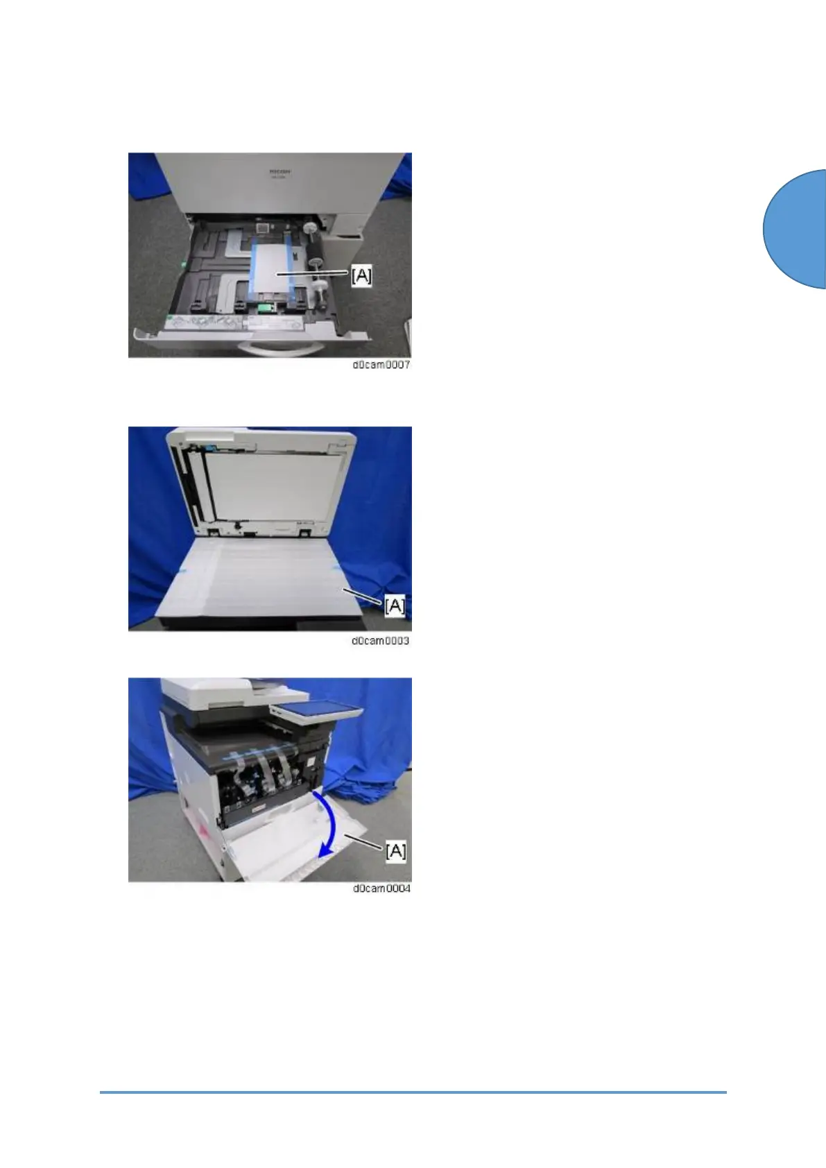 4. Open the ADF, and then remove all the tapes and the retainer (protective sheet) [A] from