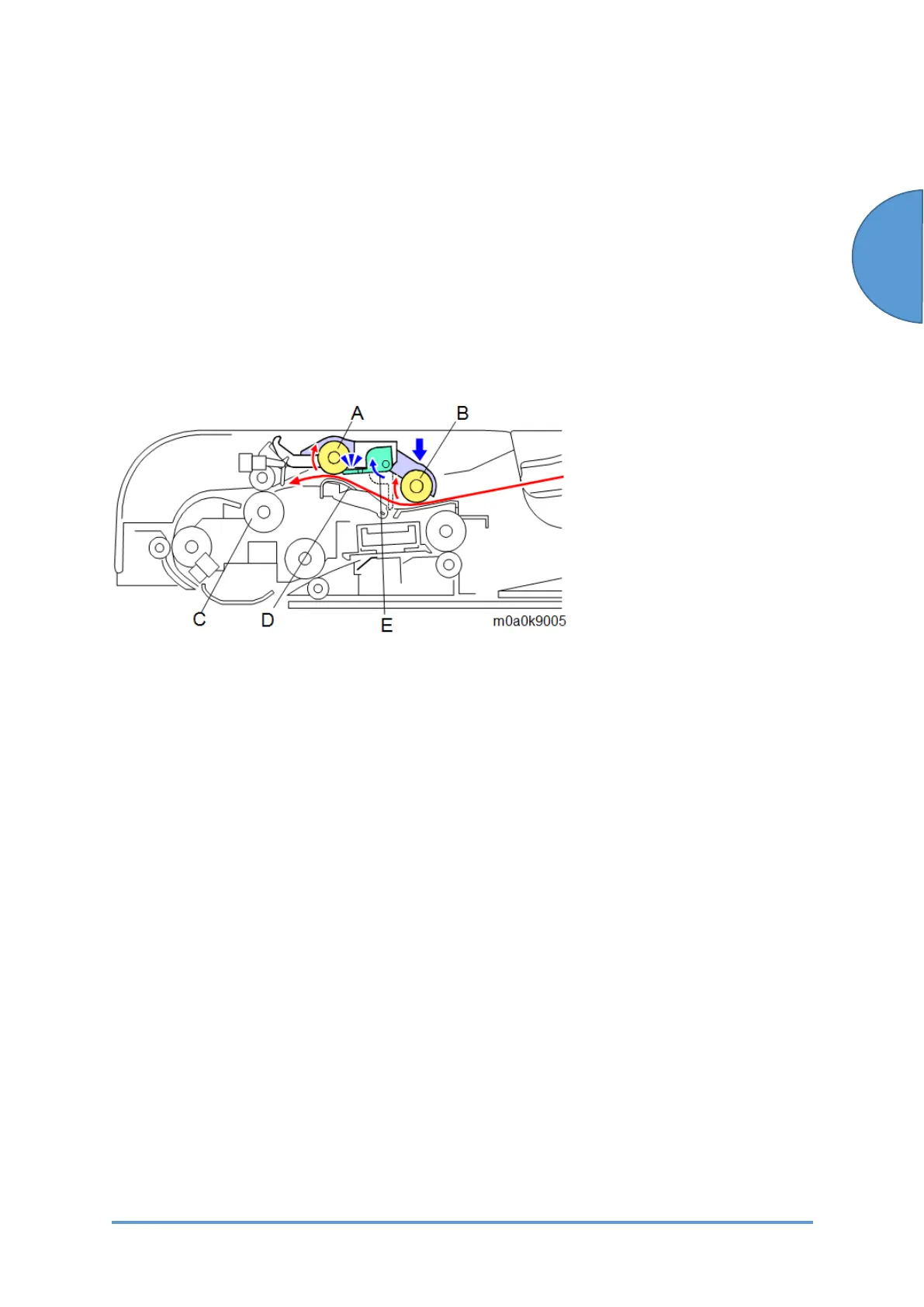 [E] out of the way, and the original can be fed from the feed roller [A] to the ADF entrance roller