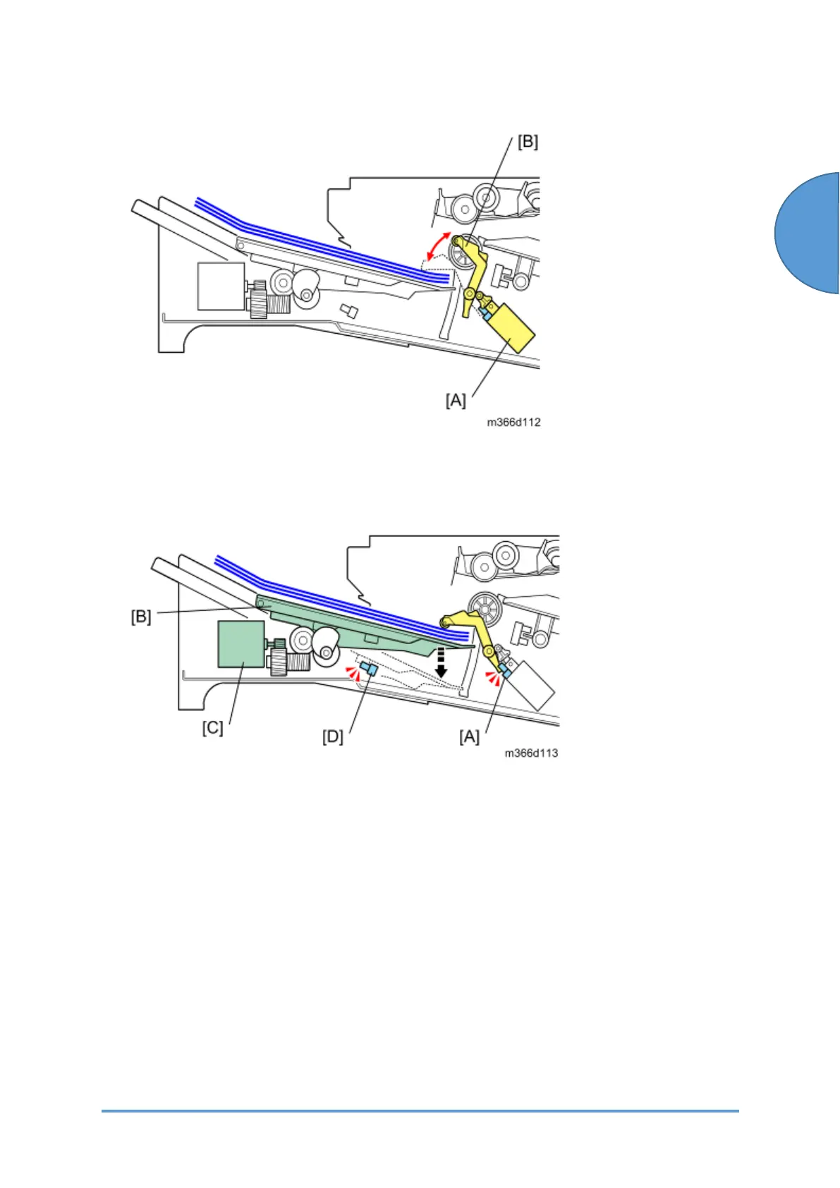 • If the tray lower limit sensor (S39) [D] is activated, the tray cannot be lowered any more.