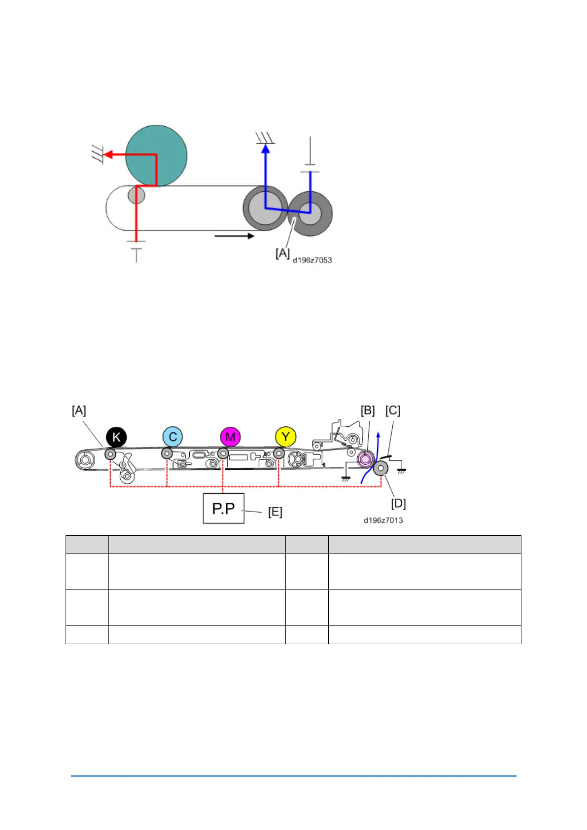 The ITB drive roller [B] and discharge plate [C] are grounded through a diode.