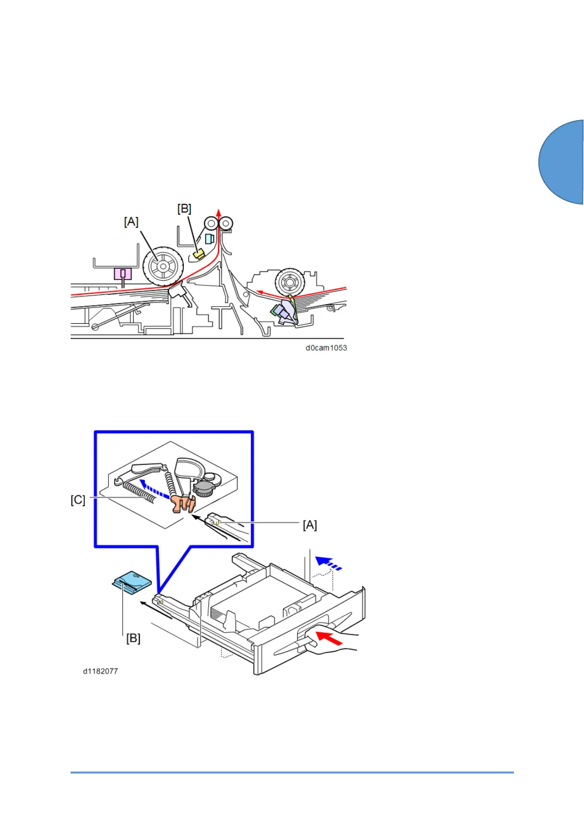 The paper feed sensor (S31) [B] monitors whether the paper is fed by the paper feed roller [A]