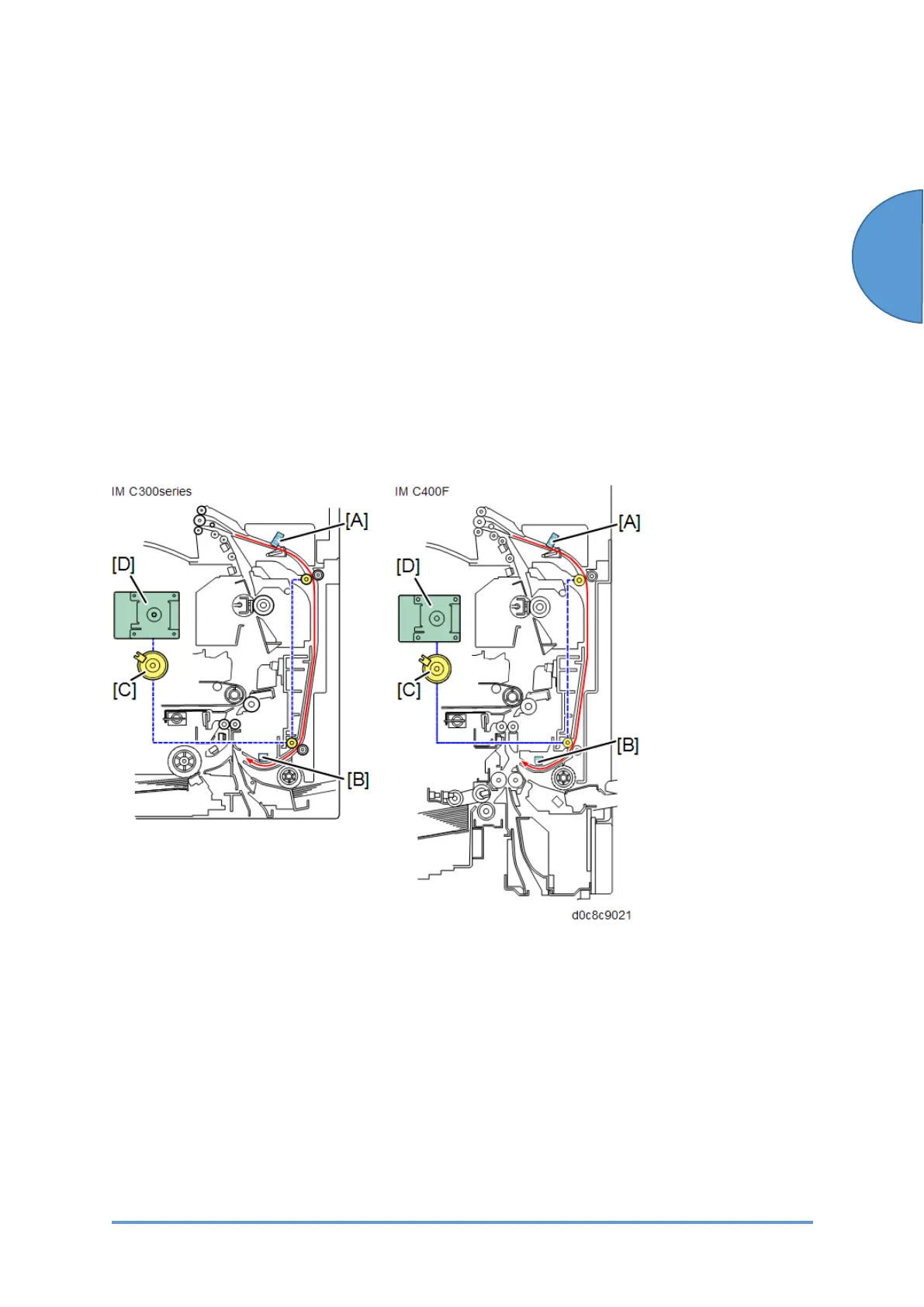 The drive from the paper transport motor (M12) [D] is transmitted to the duplex clutch