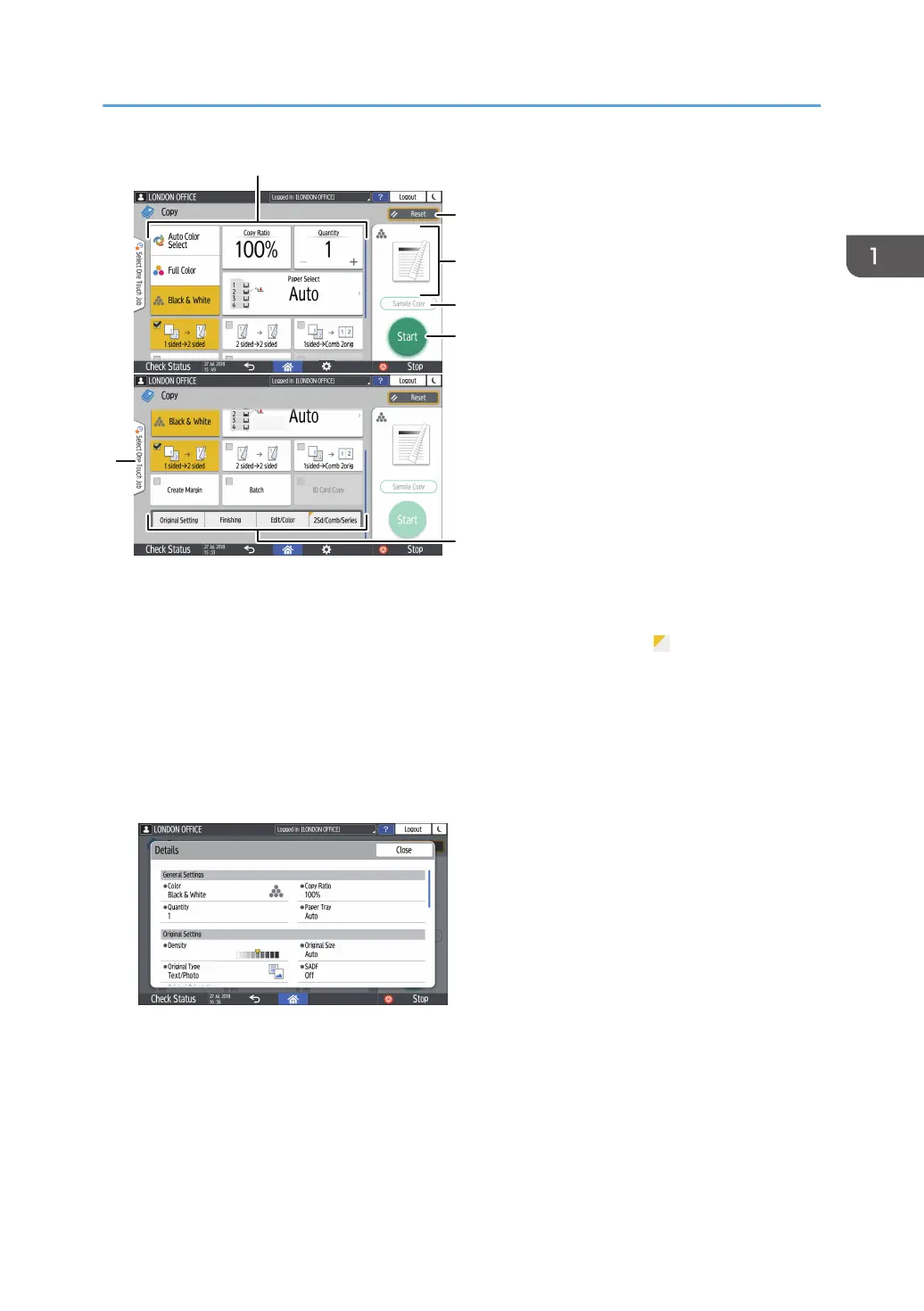 Displays an image representing the settings configured on the Copy screen. Press the image to display the list