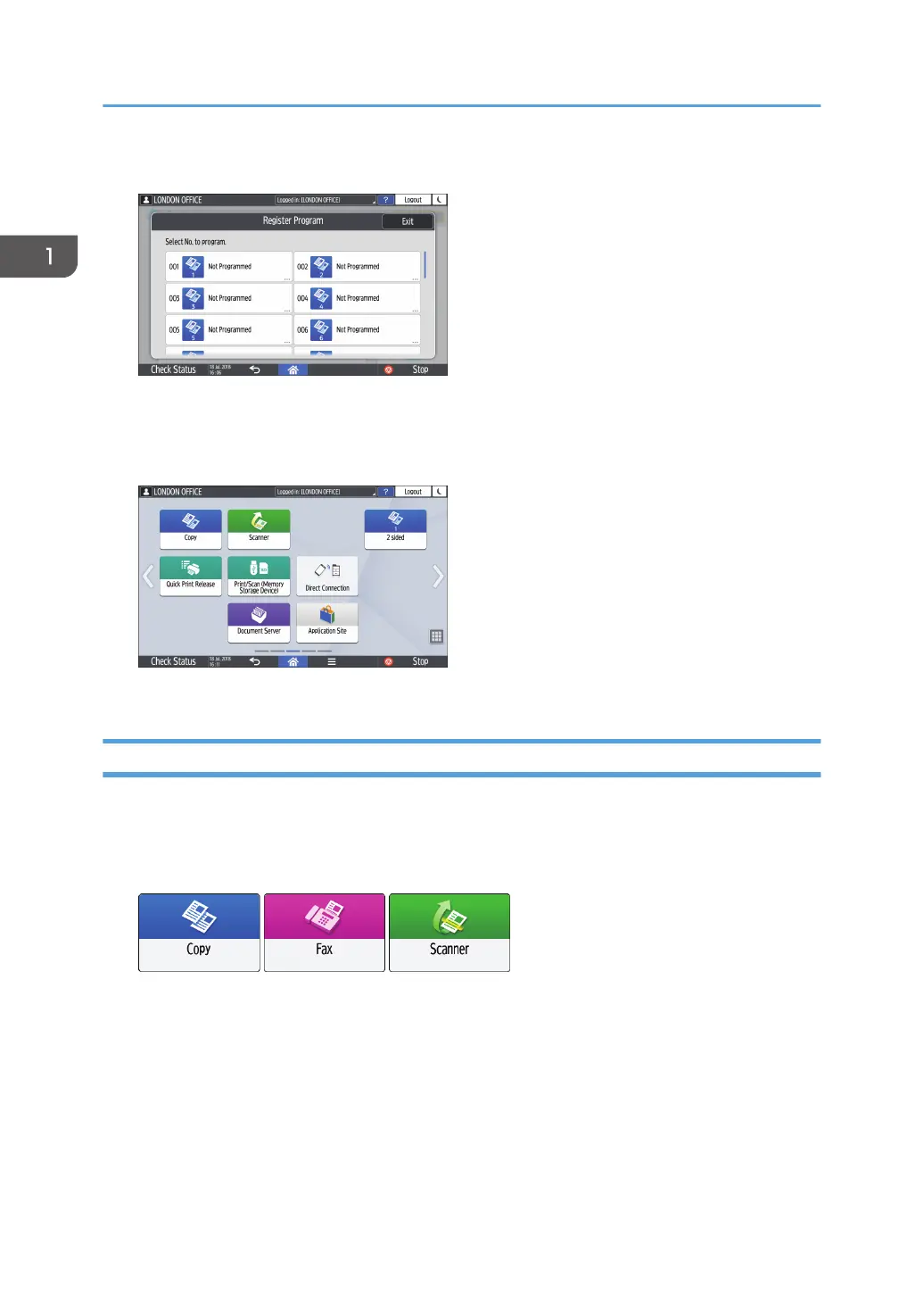 1. On the Home screen, press [Copy], [Fax], or [Scanner].