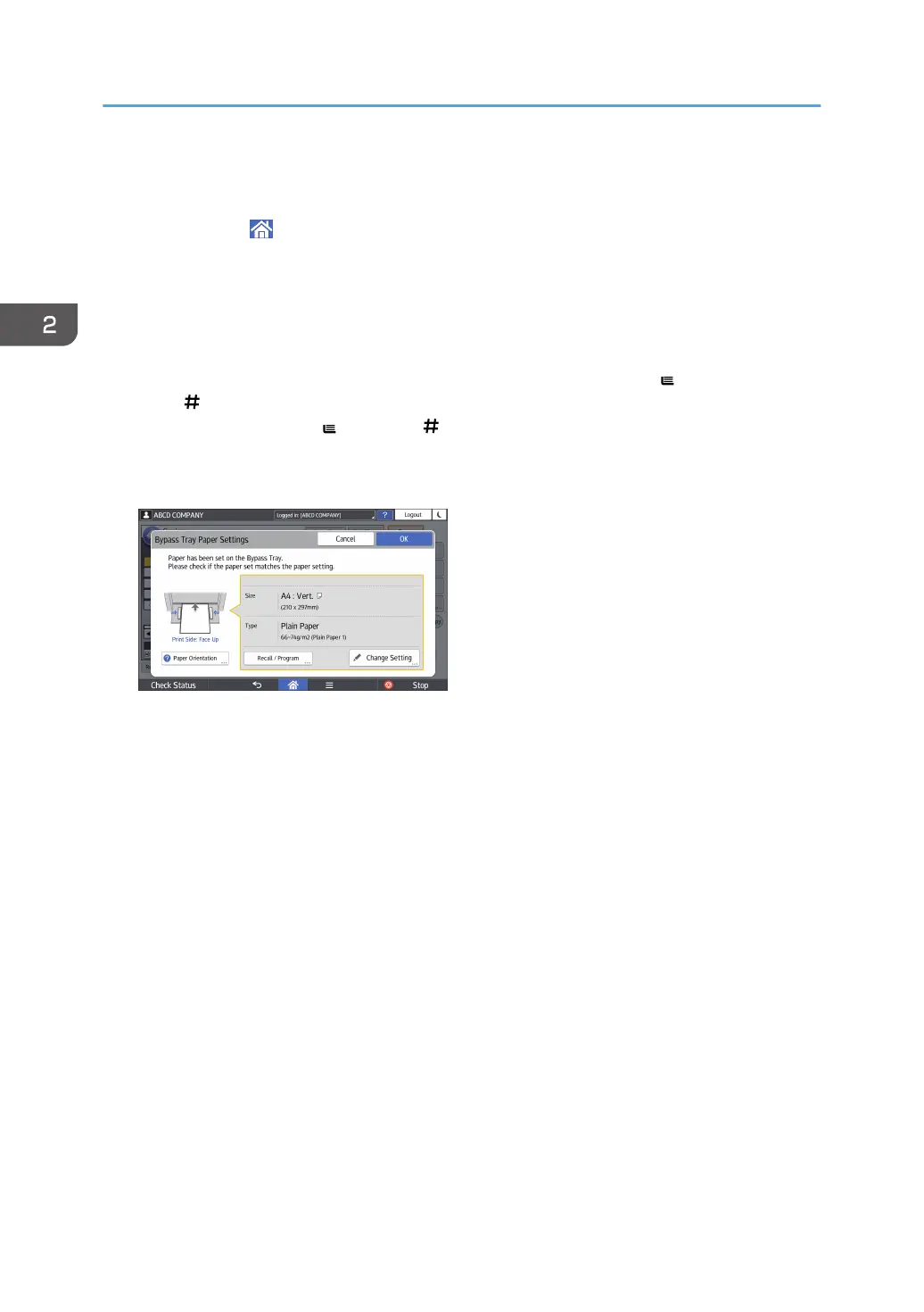 you press the bypass tray [ ] instead of [ ], the bypass tray paper settings screen is displayed.