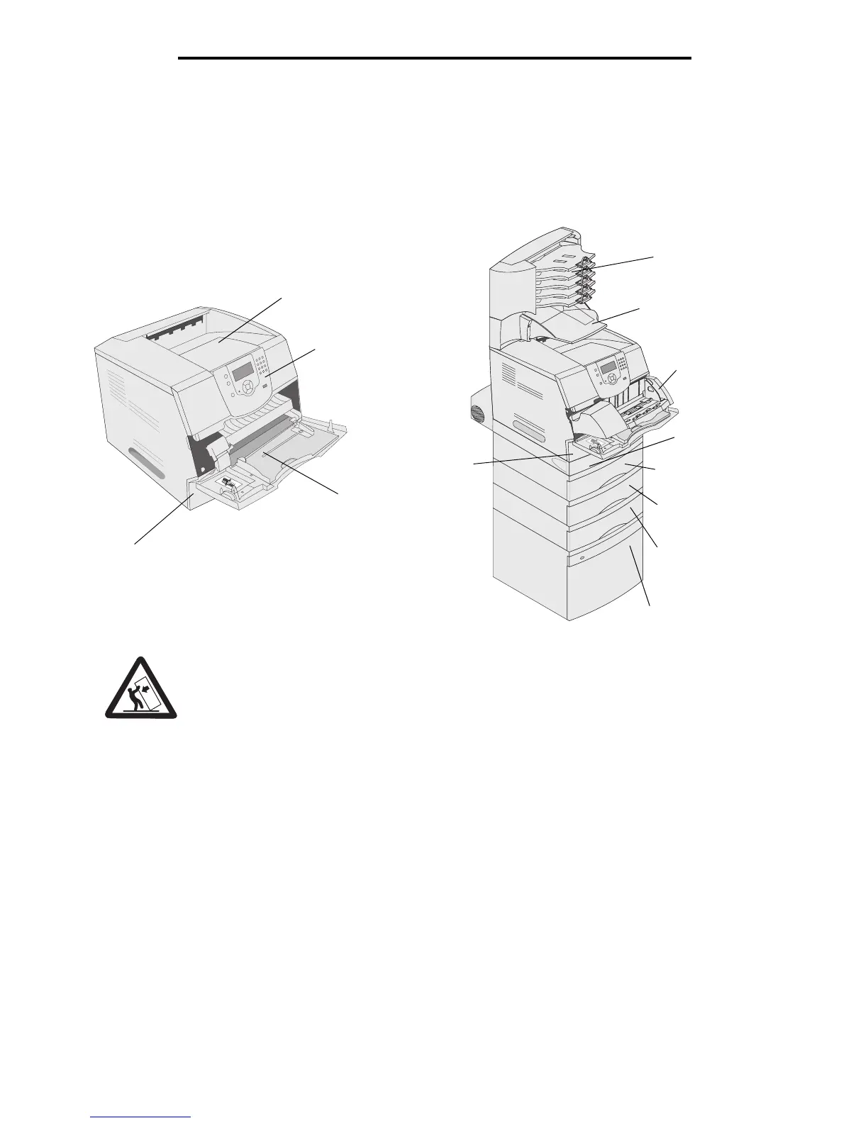 The following illustrations show a standard network and fully configured printer. If you attach print media handling options to