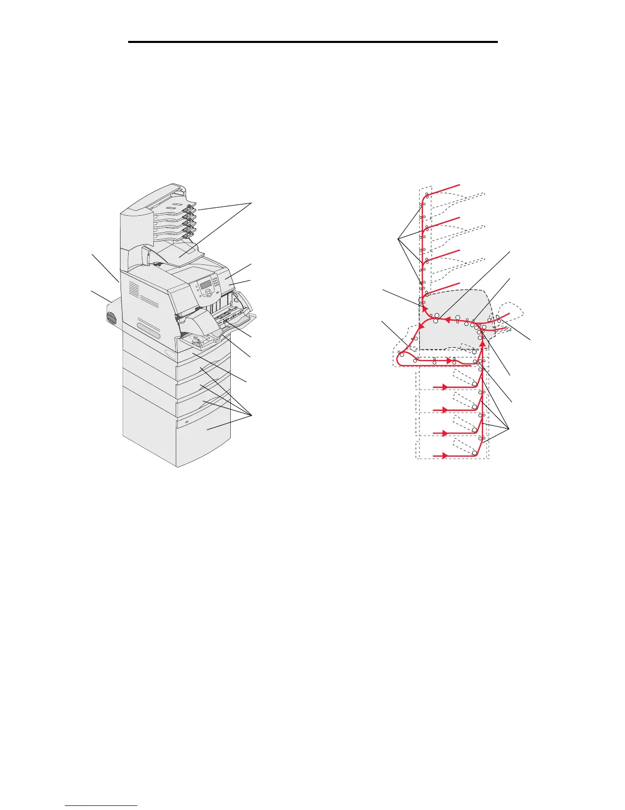 The following illustration shows the path that print media travels through the printer. The path varies depending on the input
