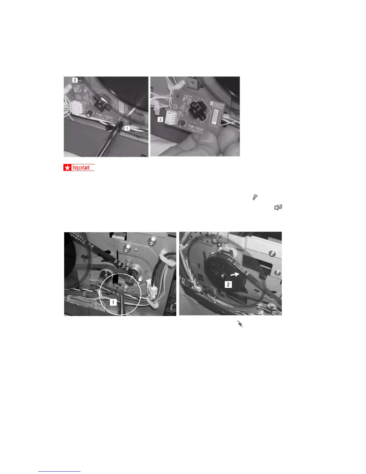 1. Unfasten the vertical encoder PCB by removing screws [1], [2] (