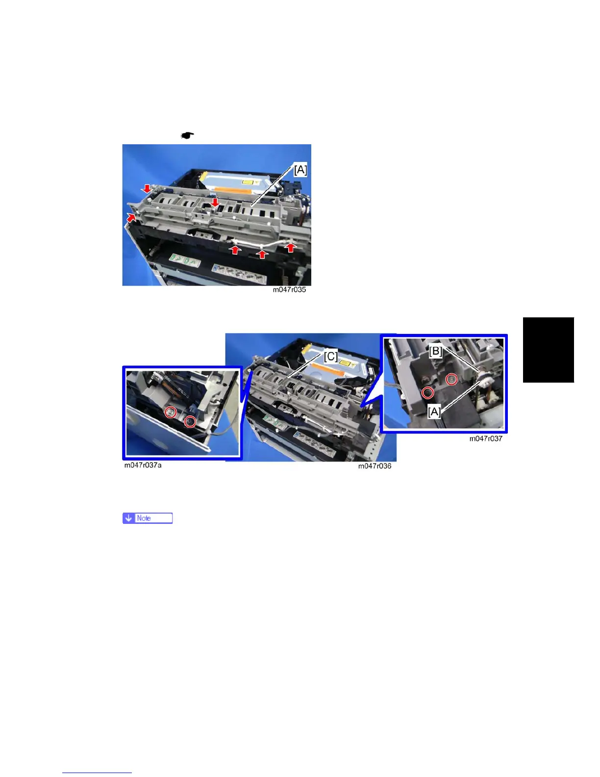 3. Take aside the harnesses on the paper exit unit [A].