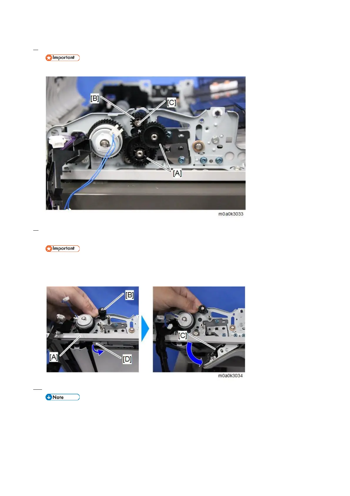 Hold the gear [B]. It is not fixed, and may drop into the machine.