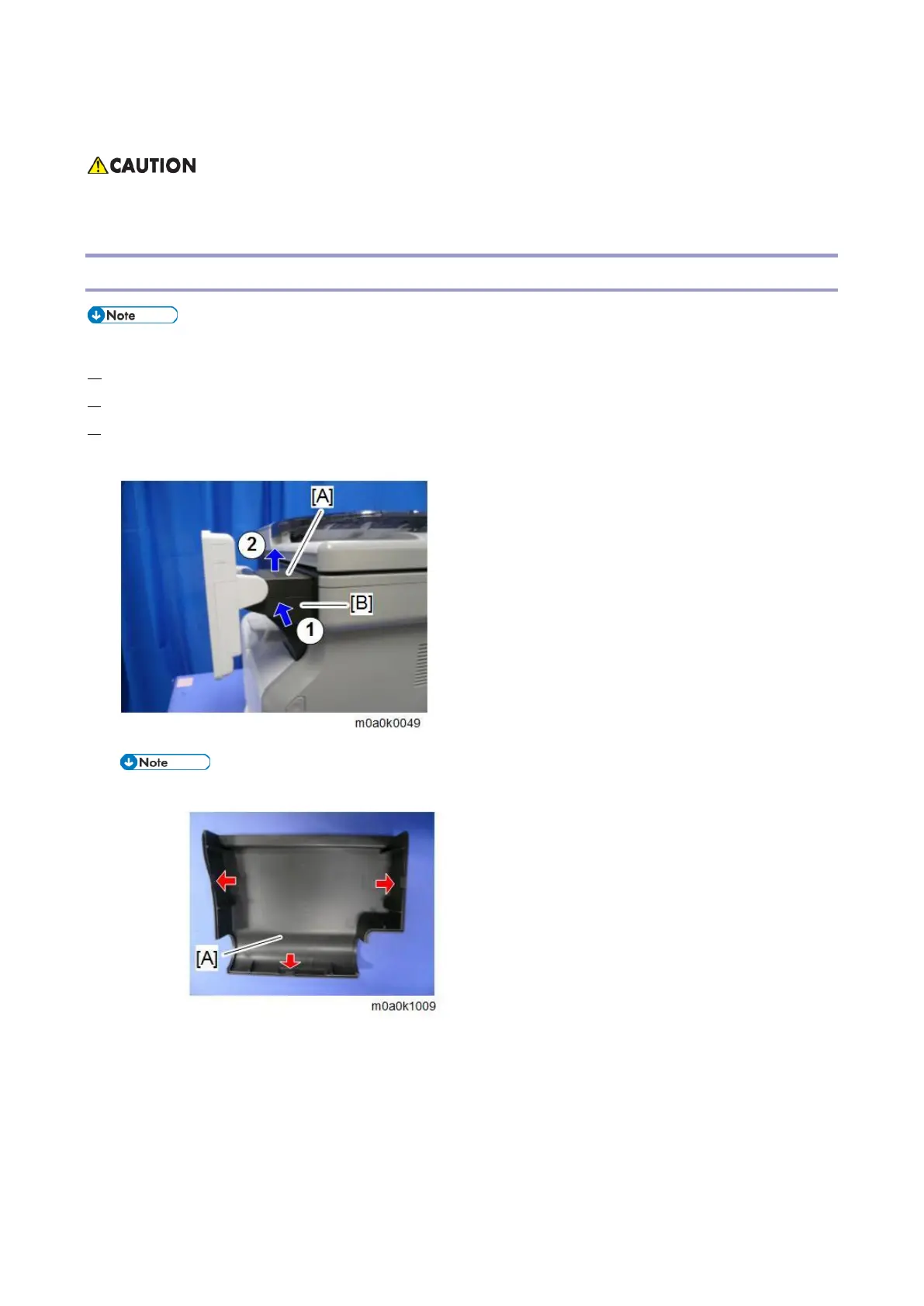 3. Pull the side of the operation panel lower cover [B] to release the hooks of the operation panel upper cover [A]