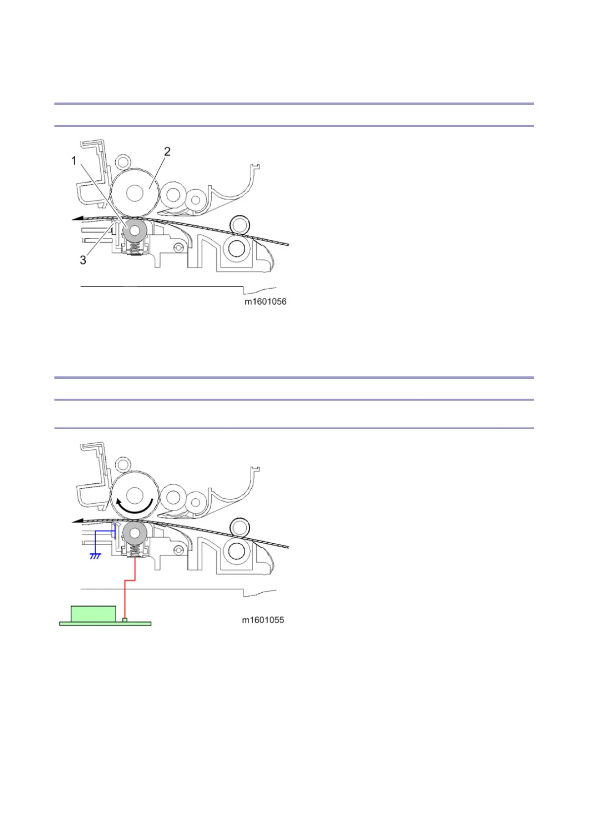 After passing through the registration unit, the paper passes between the OPC drum and the transfer roller. During this