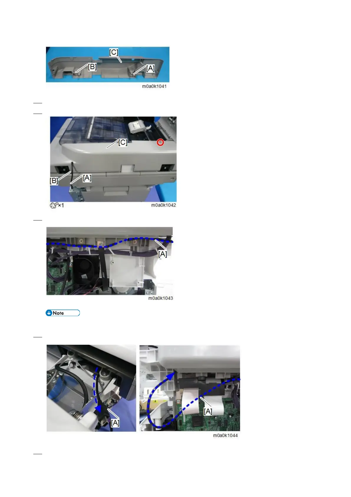 17. Pass the USB cable [A] through the hole in the SPDF rear cover and attach the short tab [B].