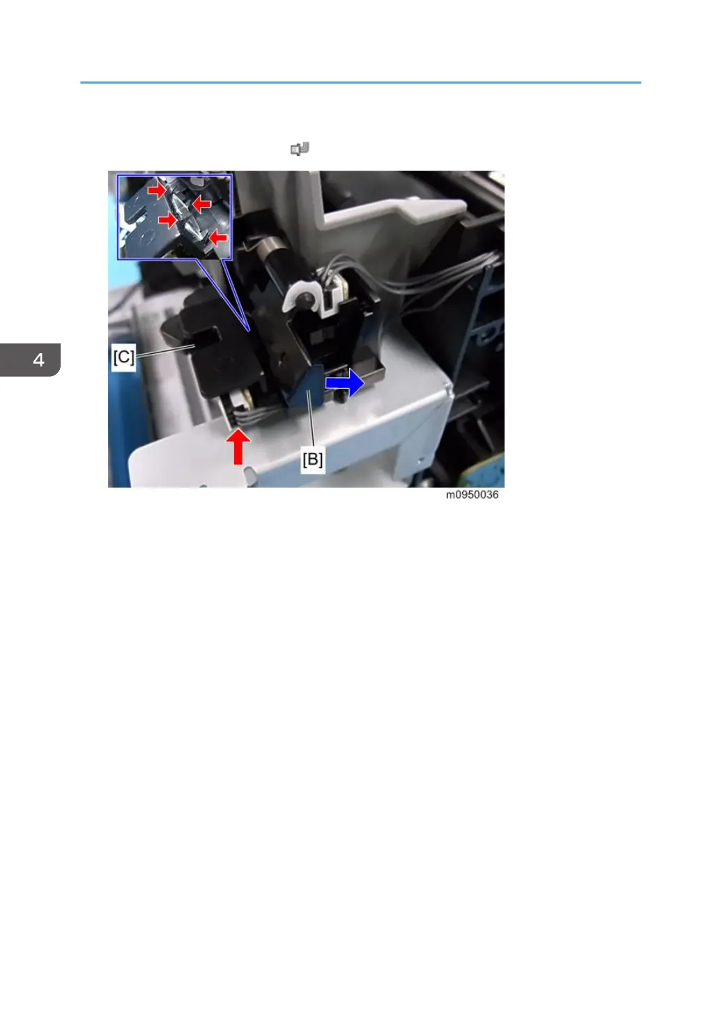 5. Remove the paper exit sensor [C] while lightly pressing the feeler [B] in the direction