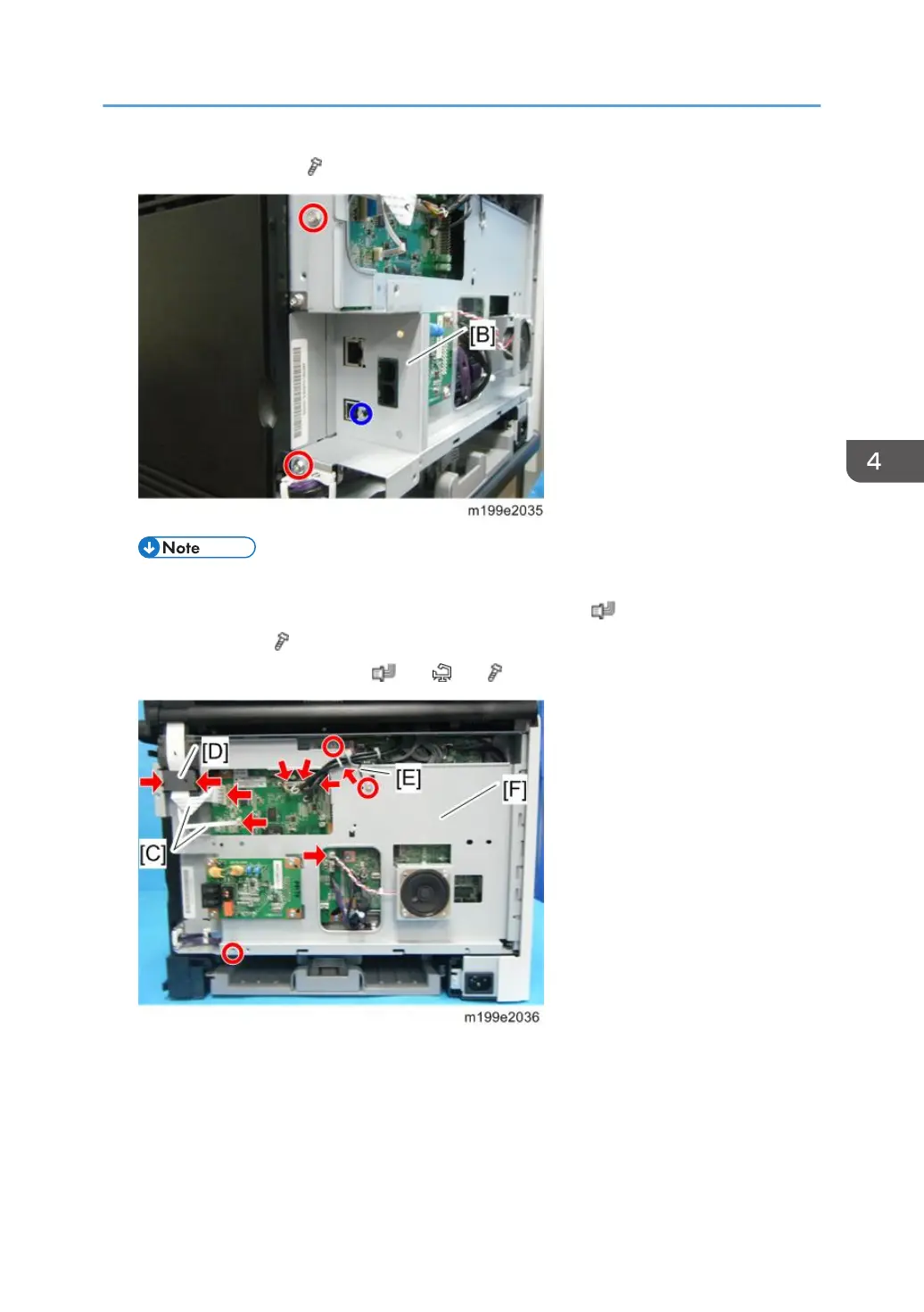 4. Disconnect the two flat cables [C] with the Ferrite core [D]. ( ×2, 2 hooks)