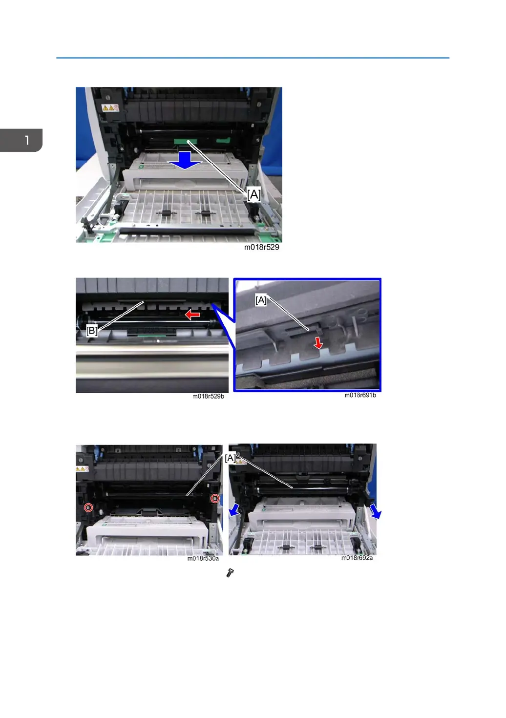 Move the guide plate [B] underneath the fusing unit to the left, and then remove it.