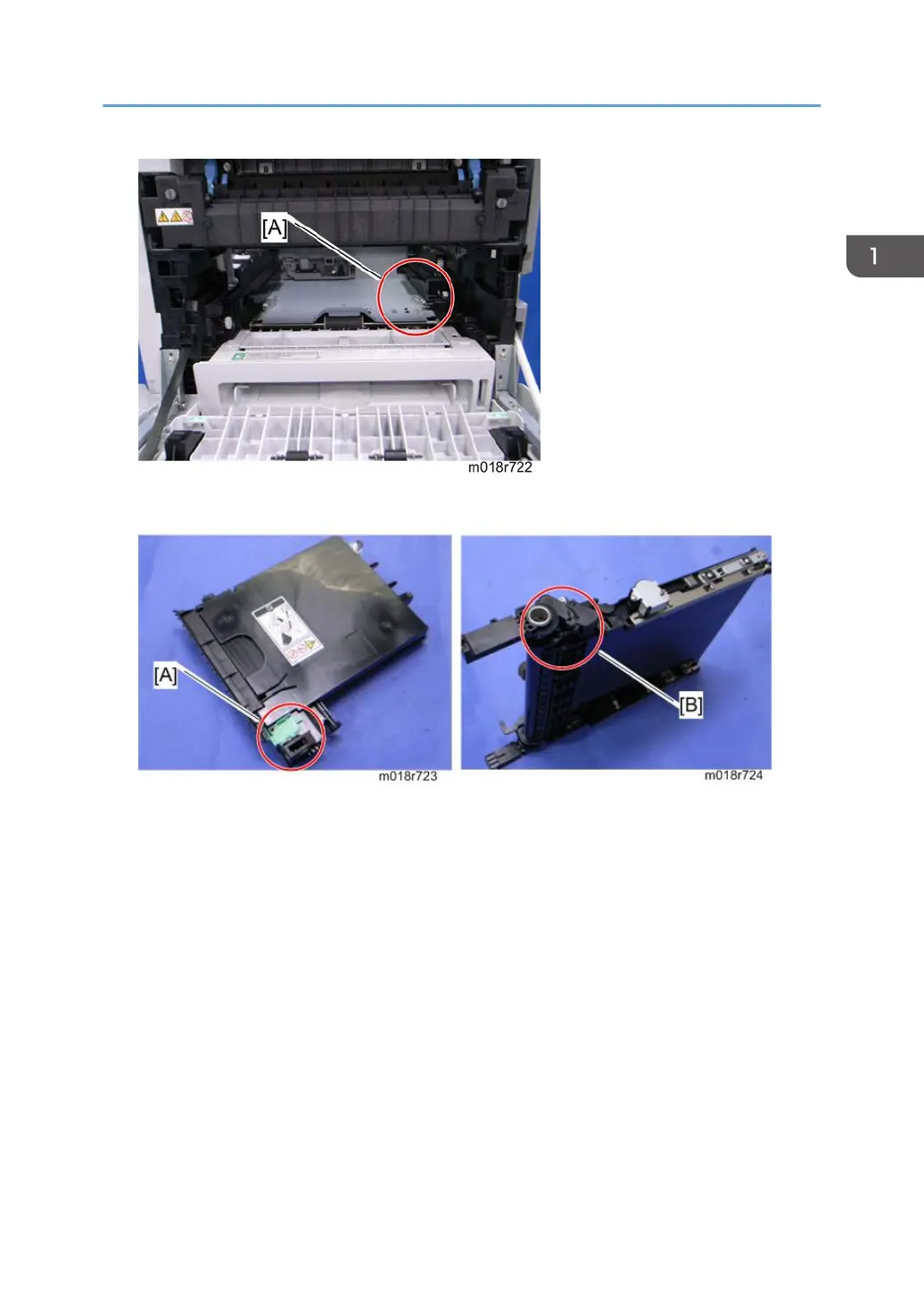 9. Clean the circled area at the waste toner bottle [A] and circled area [B] at image transfer belt unit.