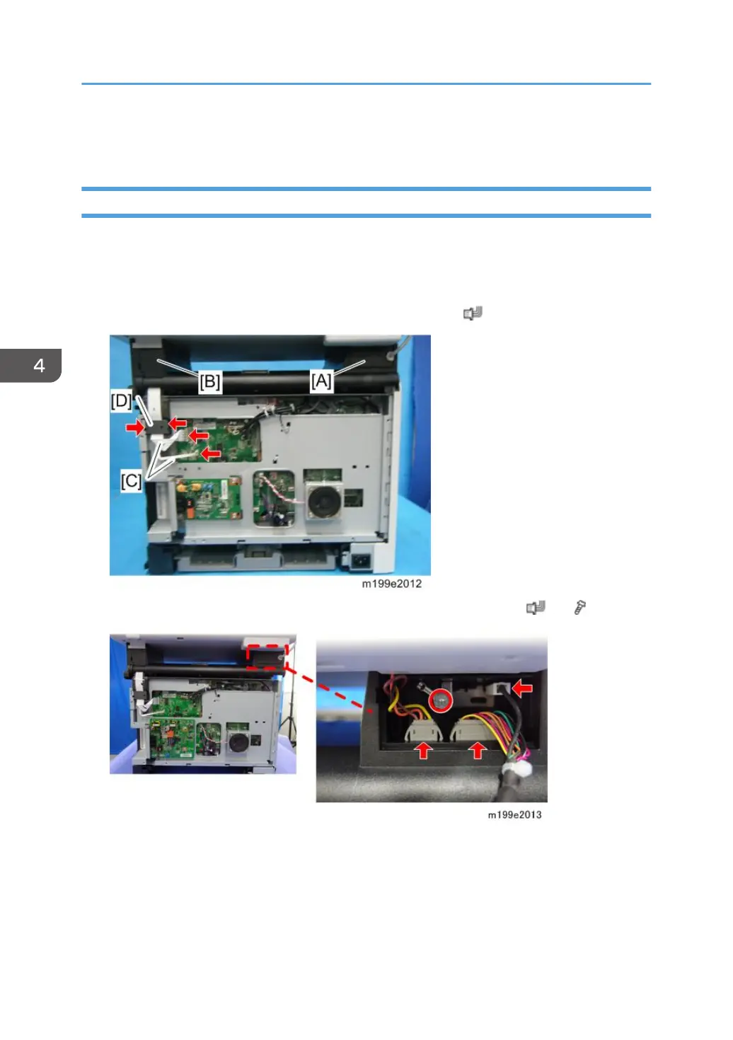 4. Disconnect the two flat cables [C] with the ferrite core [D] ( ×2, 2 hooks).