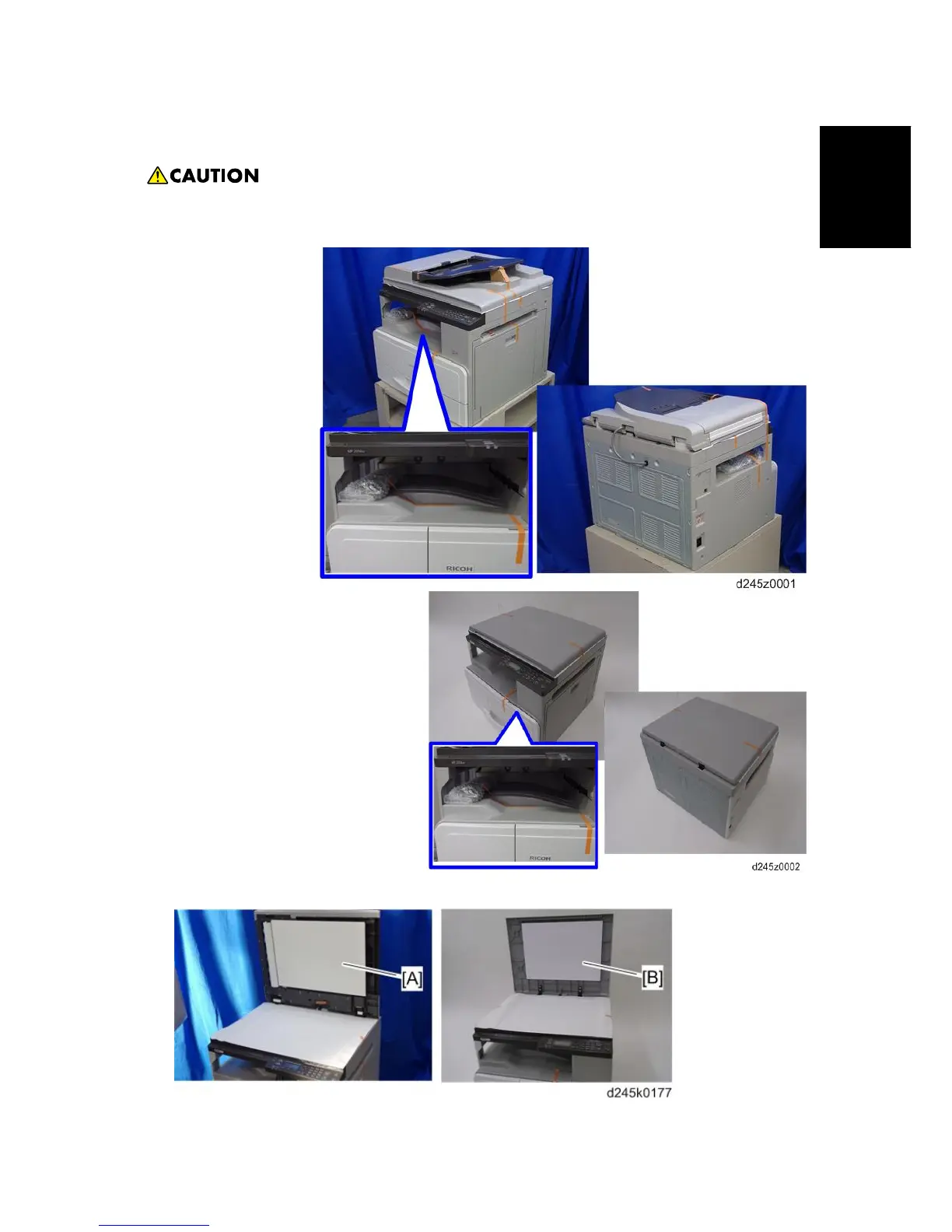 2. Open the ADF [A] or platen cover [B], and then remove the sheet and filament tapes.