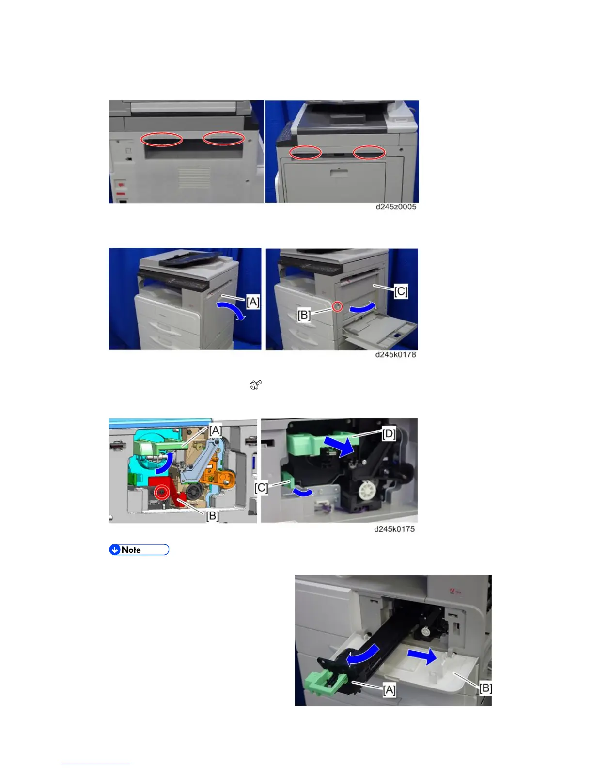 8. Release the lock lever [C], and then pull the toner bottle holder [D].