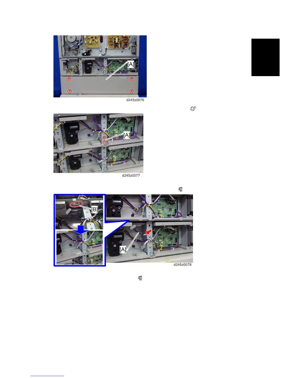 8. Release the relay harness [A] of the lower paper feed unit, and then insert the relay