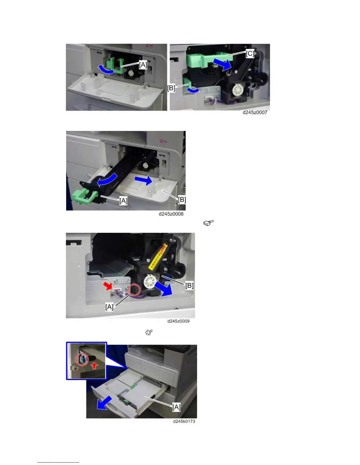 6. Remove the toner bottle holder [A] and the front door [B].