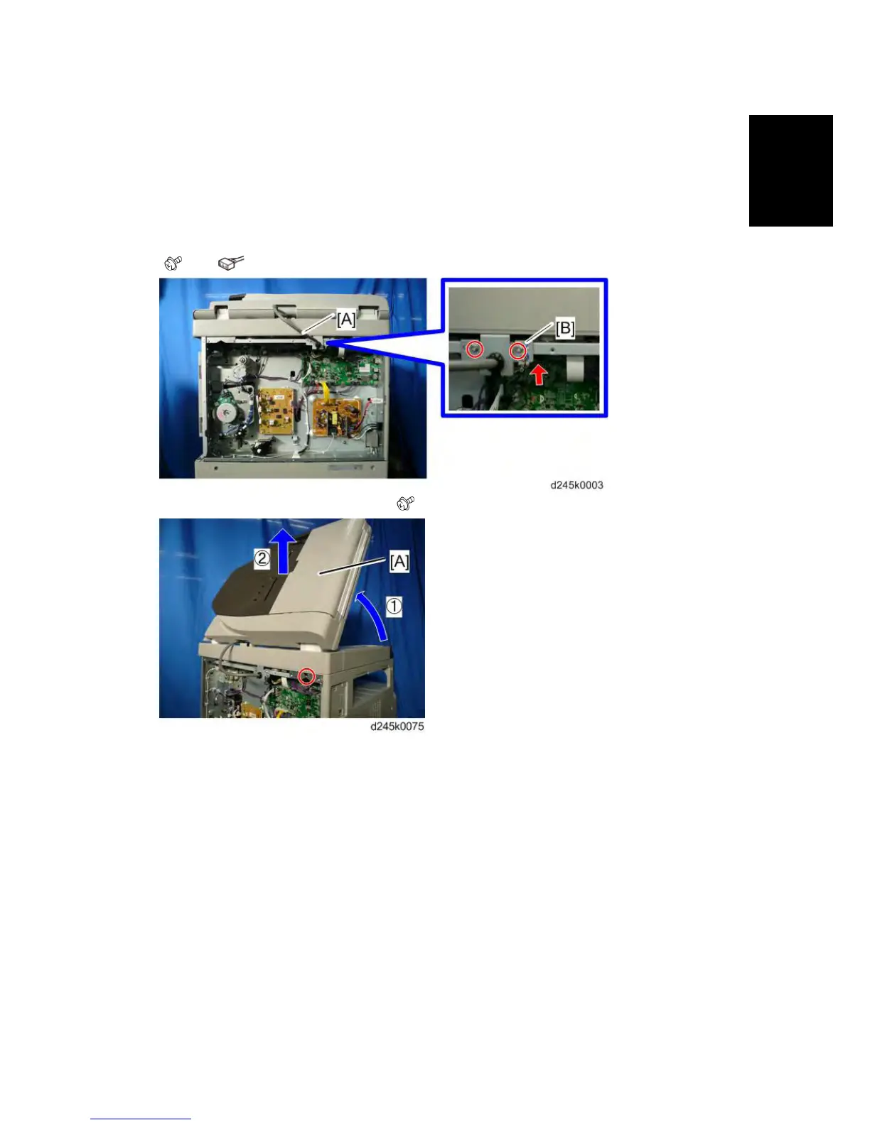 2. Disconnect the ADF cable [A] and remove the ground plate [B]