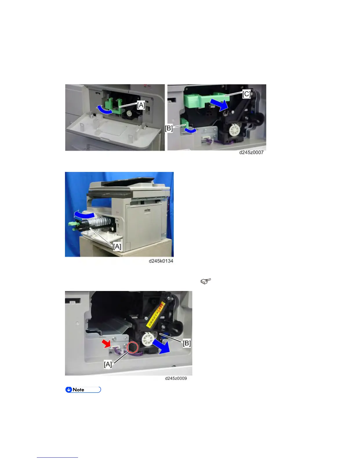 2. Release the lock lever [B], and then pull the toner bottle holder [C].