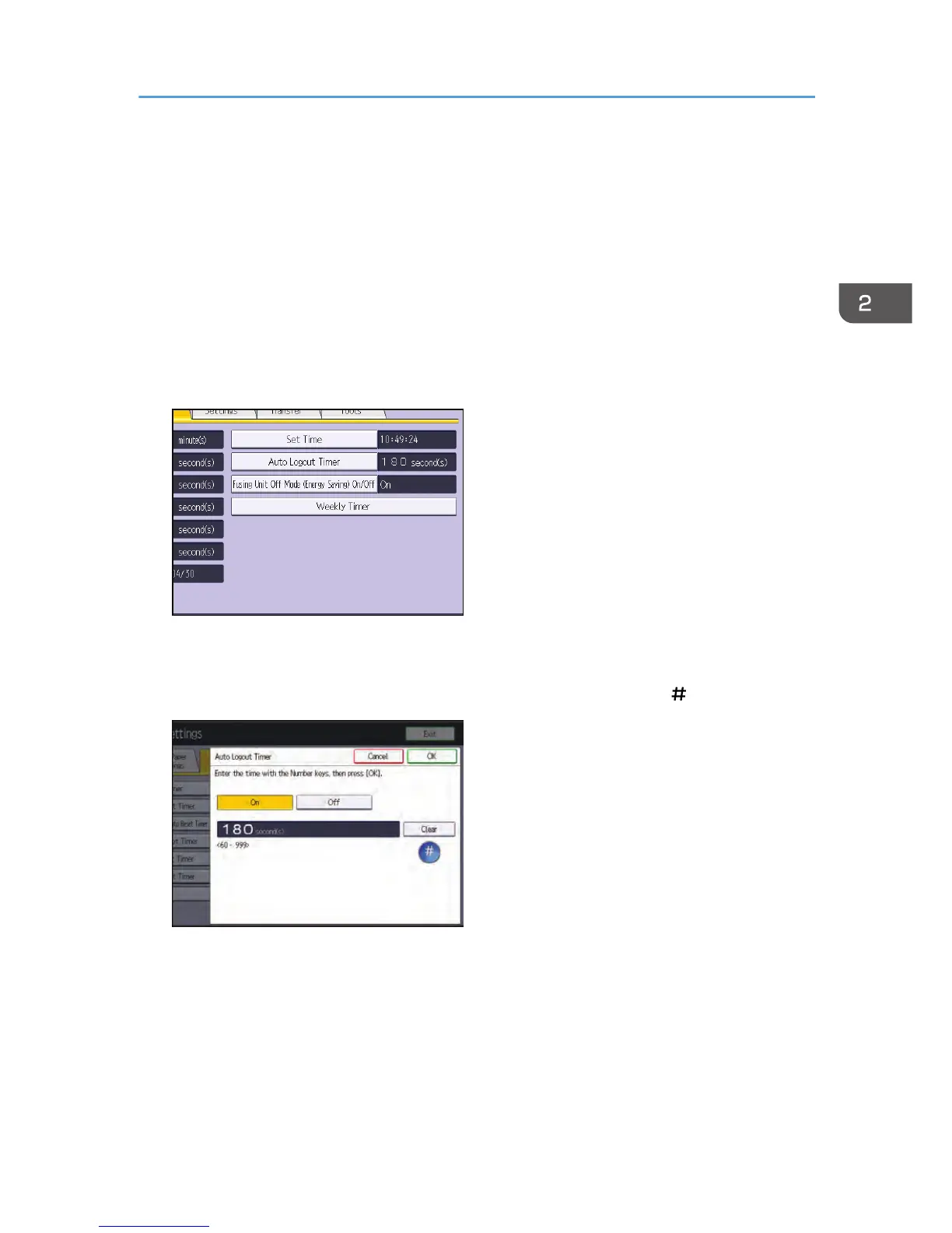 given time. This feature is called "Auto Logout". Specify how long the machine is to wait before
