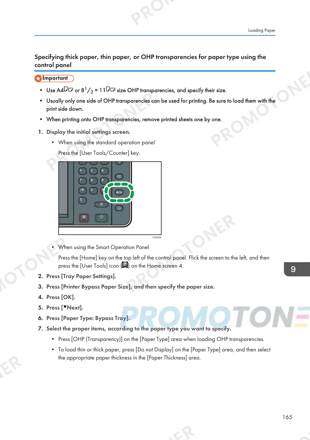 • Press [OHP (Transparency)] on the [Paper Type] area when loading OHP transparencies.