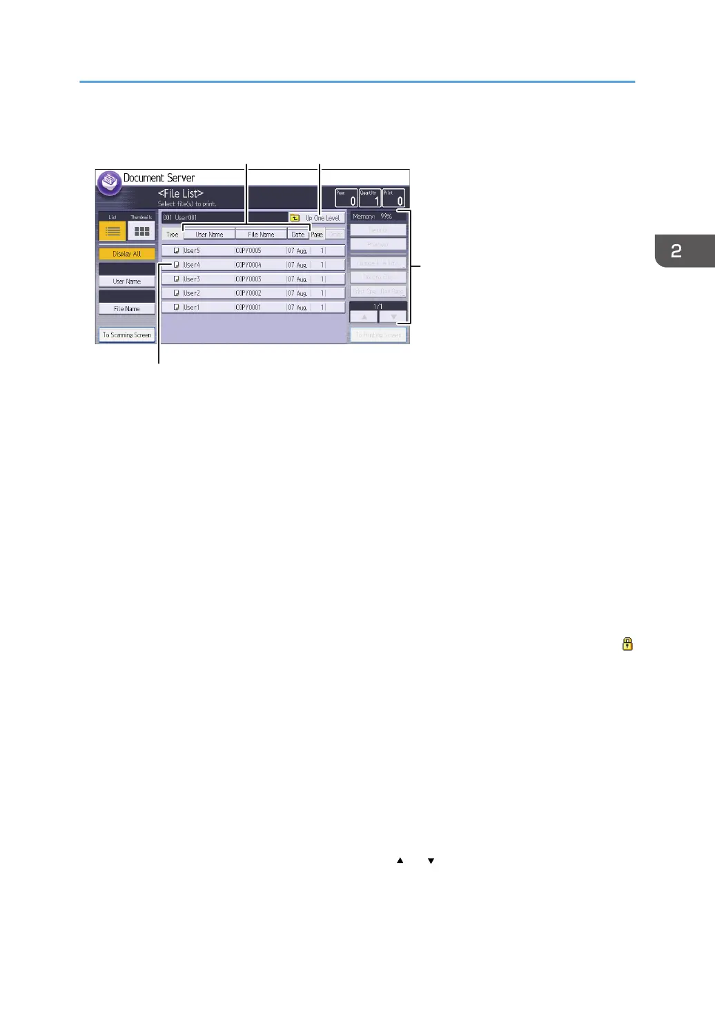 Press to display the list of stored files in the folder. If a password has been specified for a folder, a lock icon