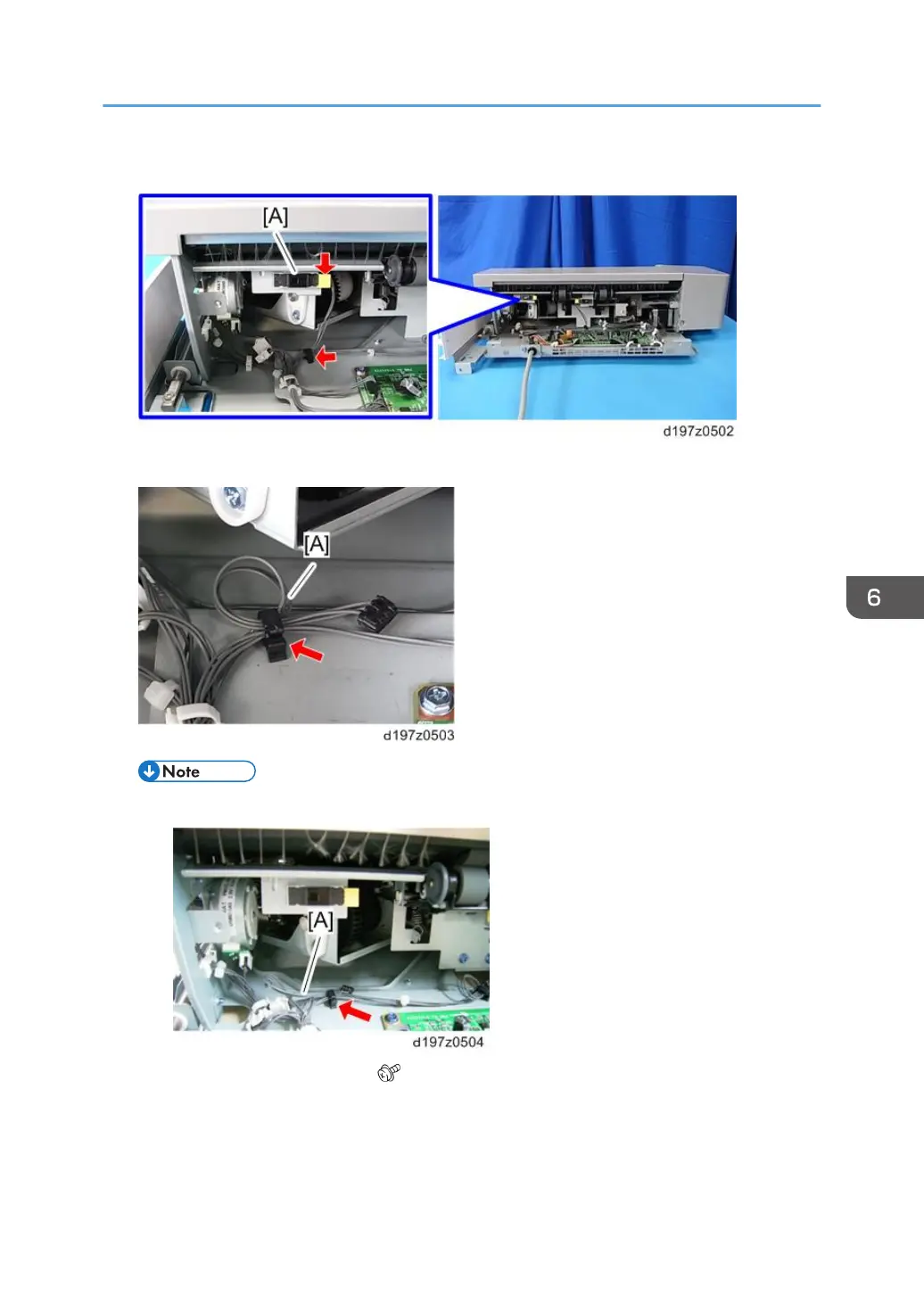 4. Release the clamp and disconnect the harness of the paper exit full sensor 2 (Staple) [A].