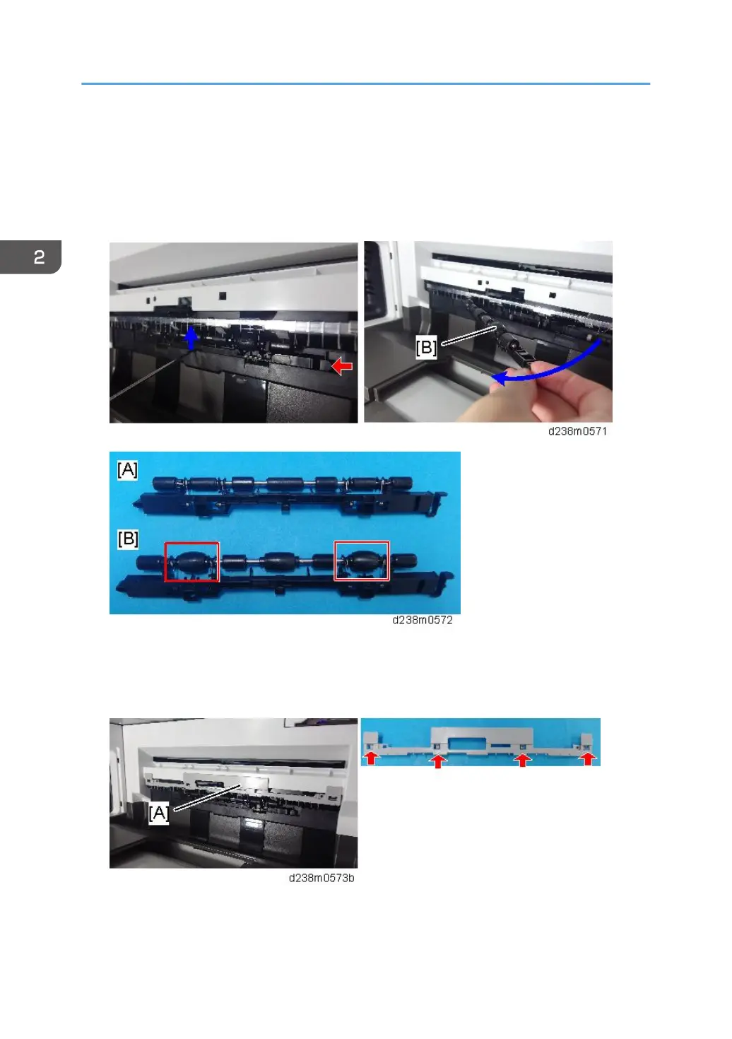6. Remove the driven roller [B] at the machine’s exit tray and attach the supplied driven