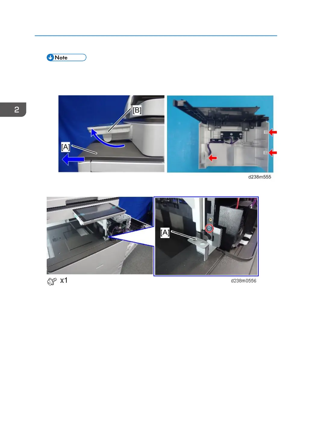Tilt the operation panel [B] upward to a horizontal position, and then remove the front upper