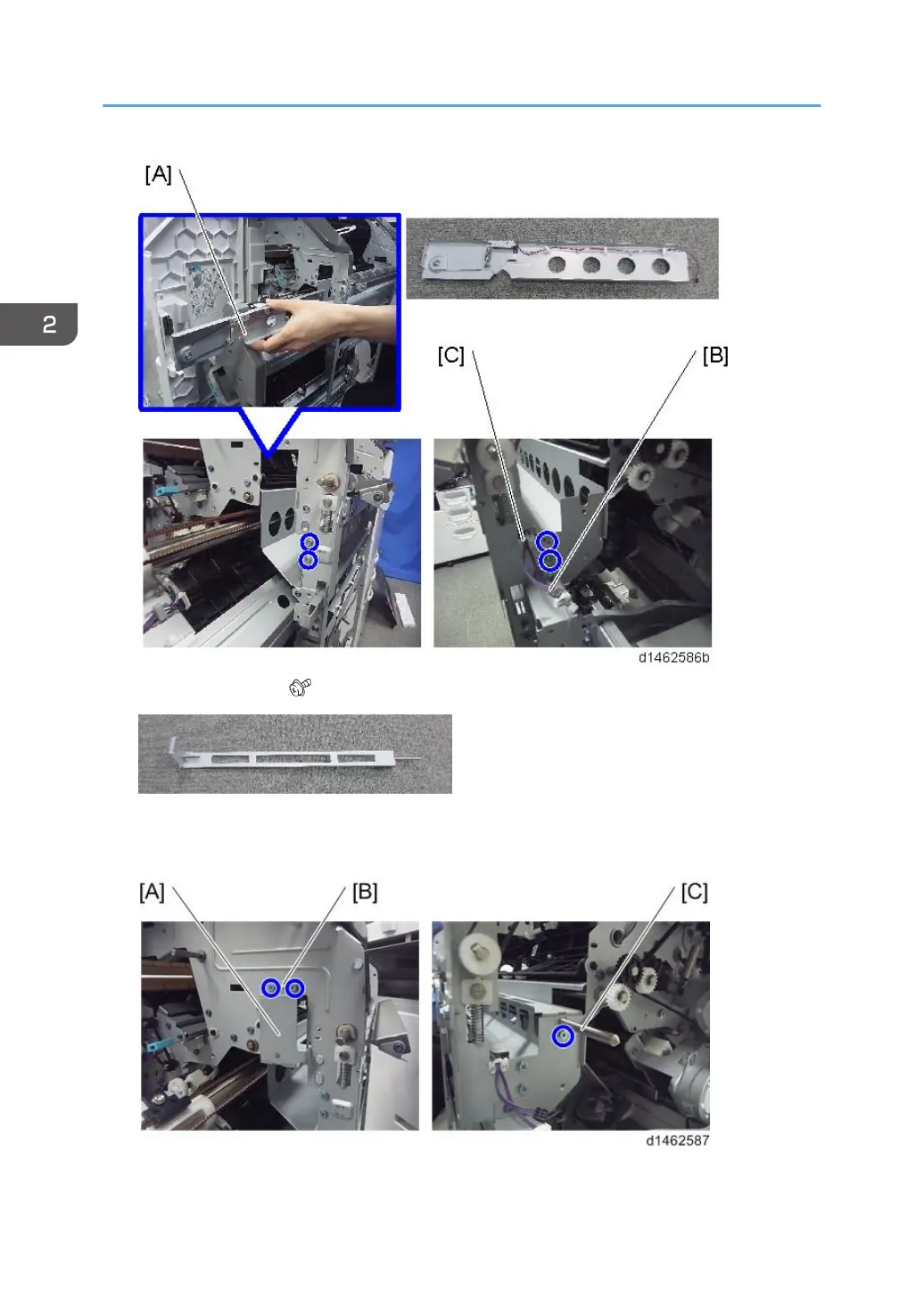Front [B]: Insert the holes in the stay over the embossed parts on the finisher.