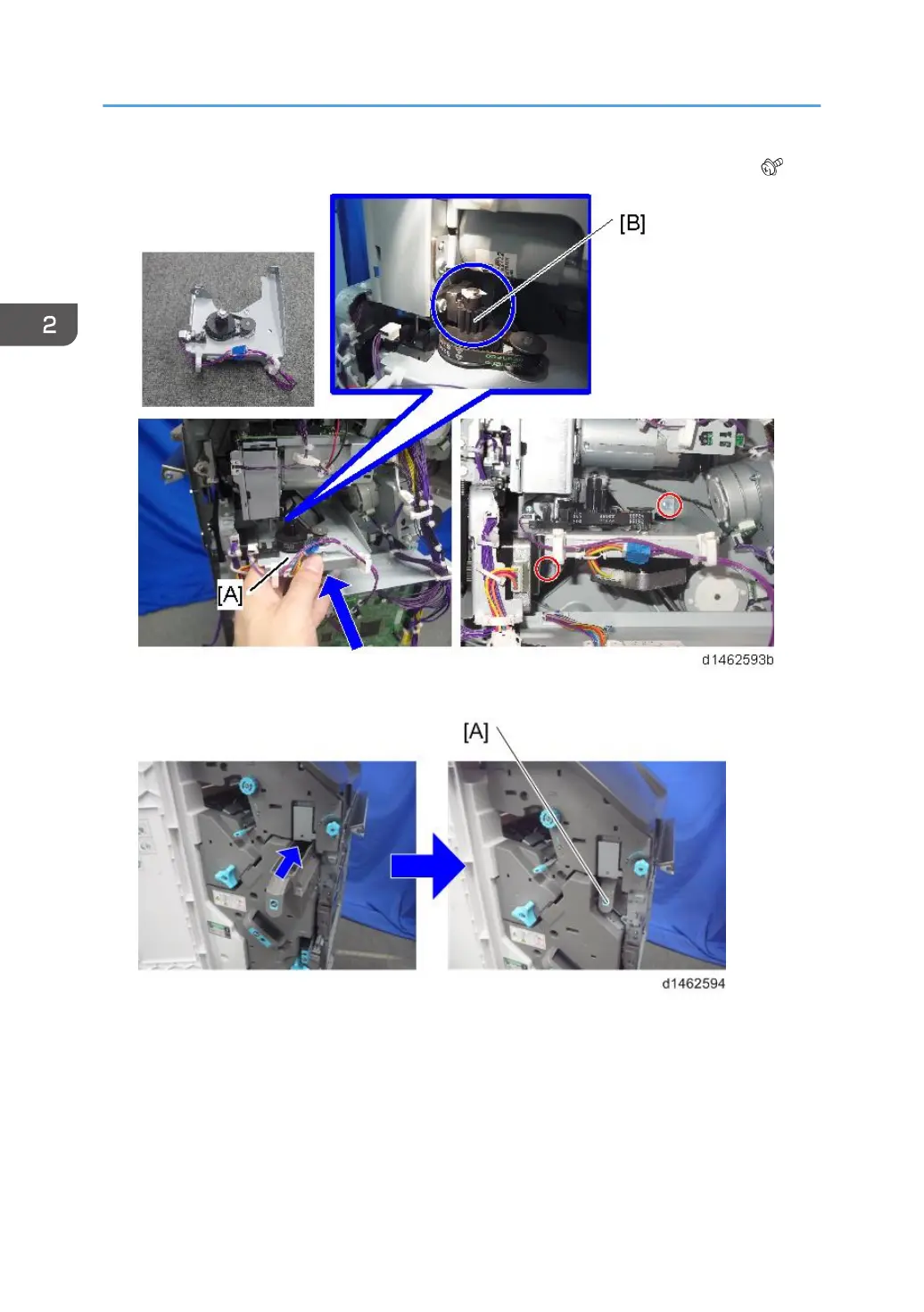 16. Attach the punch unit movement motor unit [A] so that the gear [B] meshes firmly ( ×2).