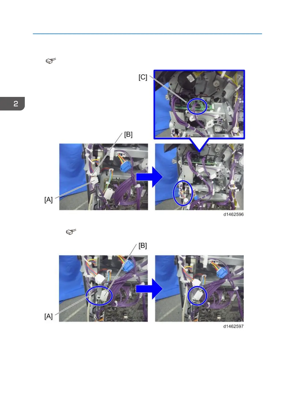 19. Remove the harness [A] from the clamp [B], and connect it to the punch unit board [C]
