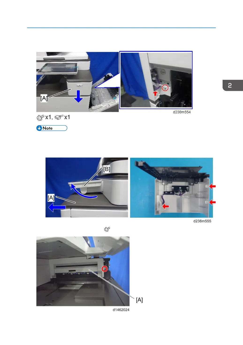 • Tilt the operation panel [B] upward to a horizontal position, and then remove the front upper
